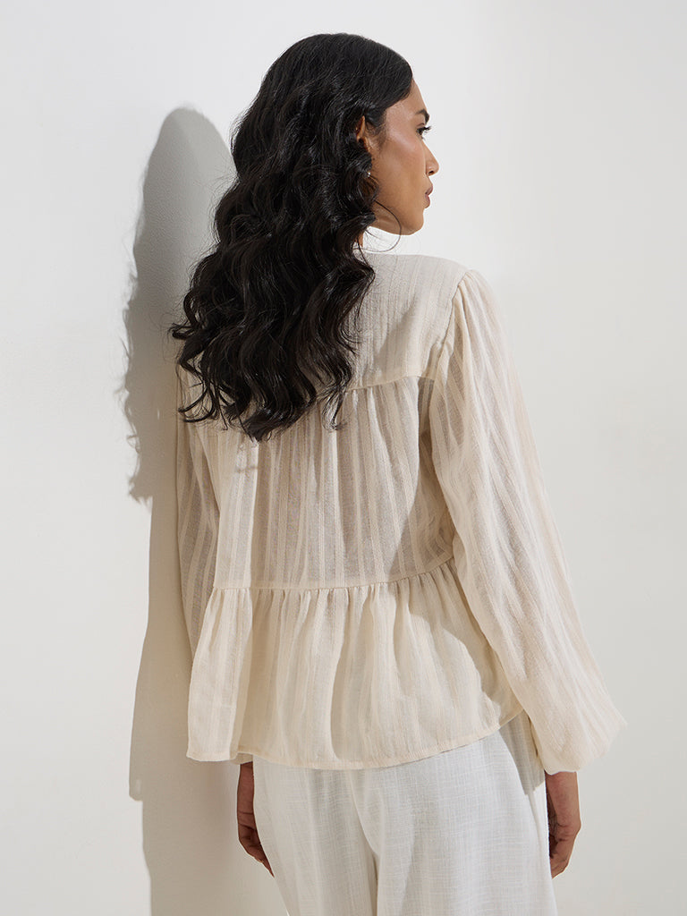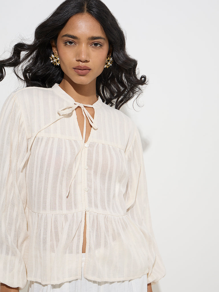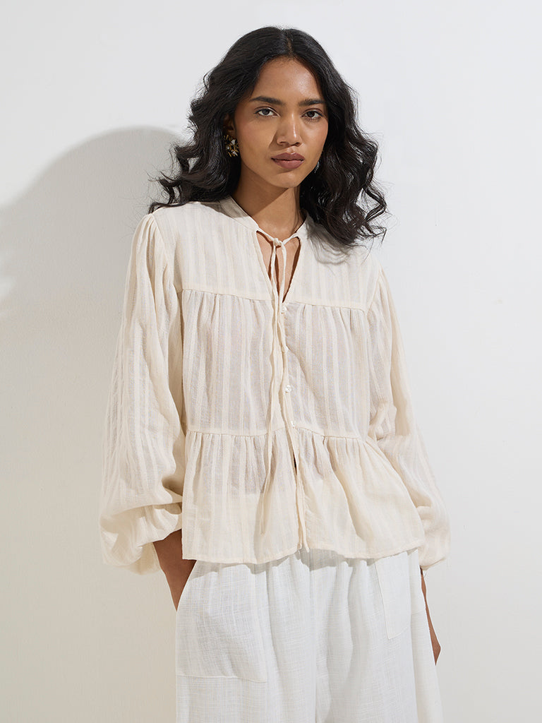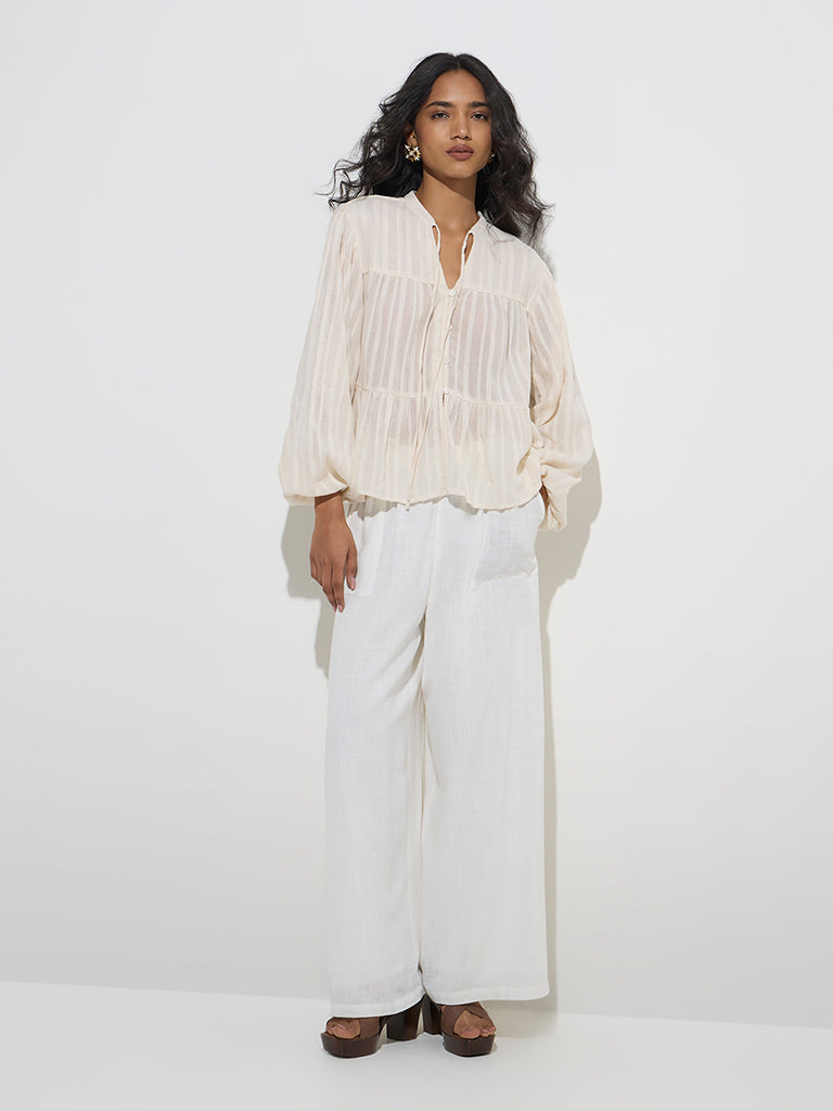 This off-white top from LOV is defined by self-striped patterns that lend a stylish upgrade to your casual contingent. Spun from a lightweight fabric for breezy comfort. it features a Keyhole neck with a tie-up detail that flows into a button placket. The peasant sleeves add a soft. feminine silhouette. making it a versatile pick for both work and weekend plans.