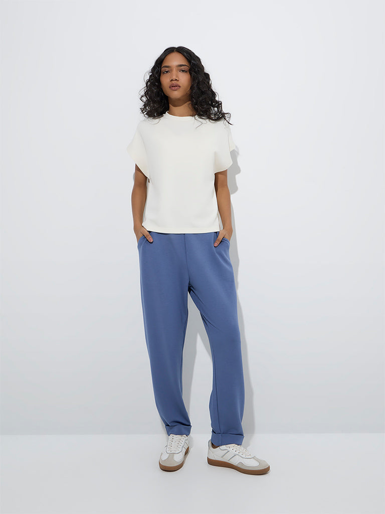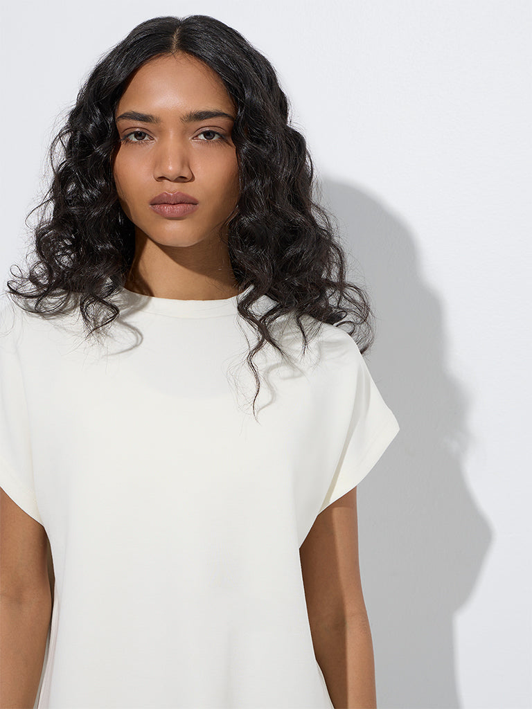 This off-white t-shirt from LOV is spun from a breathable fabric that ensures comfort through active days. Designed with a classic crew neck and relaxed dolman sleeves. it makes an easy-going essential for everyday styling.