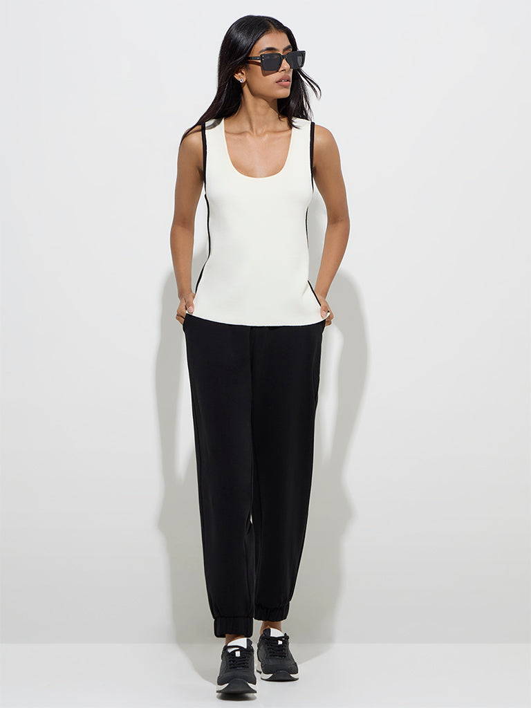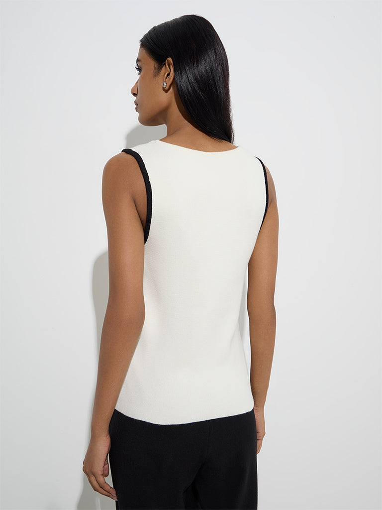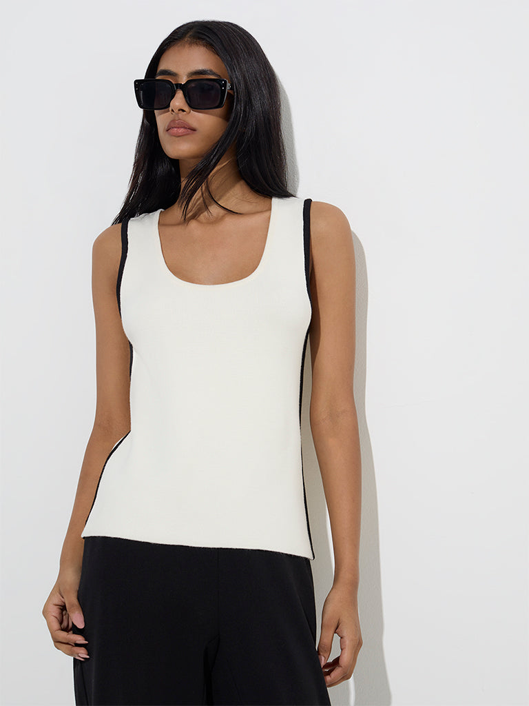 This LOV off-white top is elevated with a sleek contrast hemline that brings a modern edge to its classic silhouette. Spun from a breathable fabric. it features a scoop neck and a sleeveless cut for easy. everyday styling.