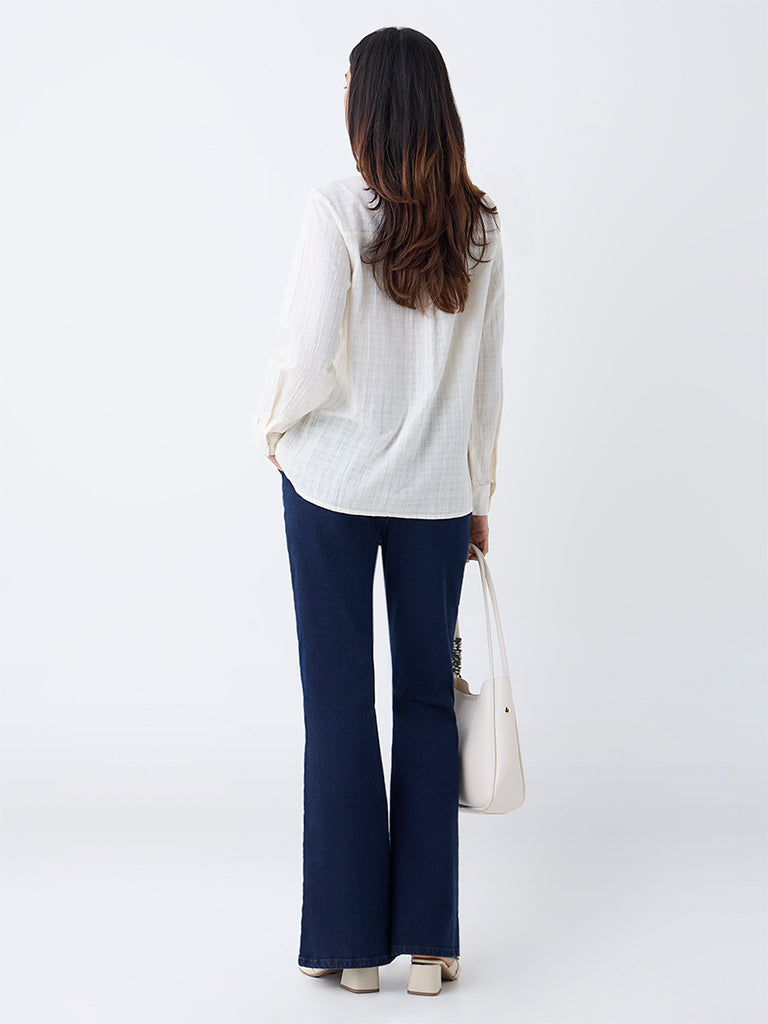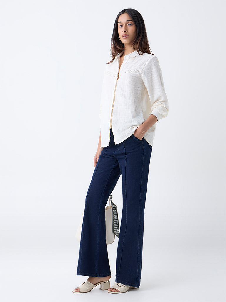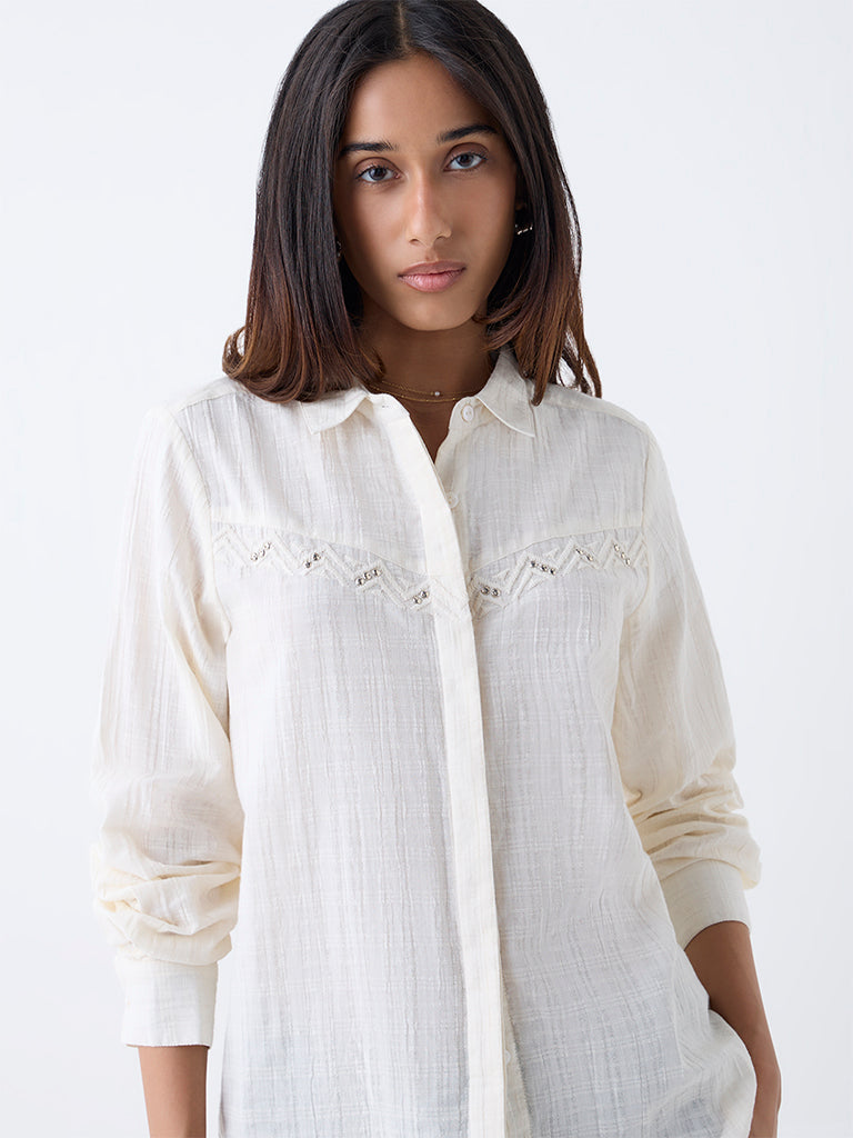 This off-white shirt from LOV is framed with a straight-point collar. a button-up front and full sleeves. It features tonal geometric embroidery adorned with stud embellishments. on a soft. breathable fabric. providing refined details and a sumptuous feel. This piece is perfect for adding effortless style to your everyday wardrobe.