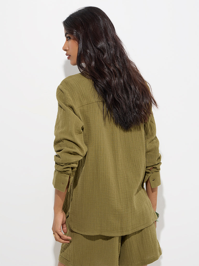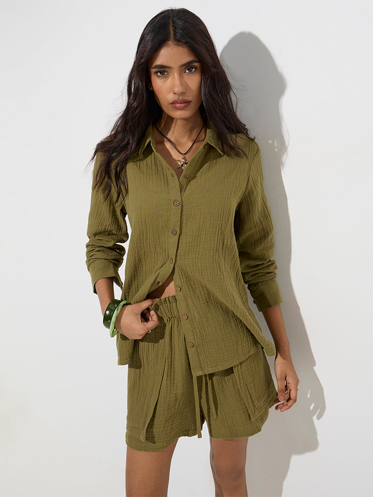 Lending texture to simplicity. this olive shirt from LOV is defined by its softly crinkled finish that brings a sense of effortless ease. Framed with a spread collar and a classic button placket. it’s cut with full sleeves for a refined yet relaxed silhouette.