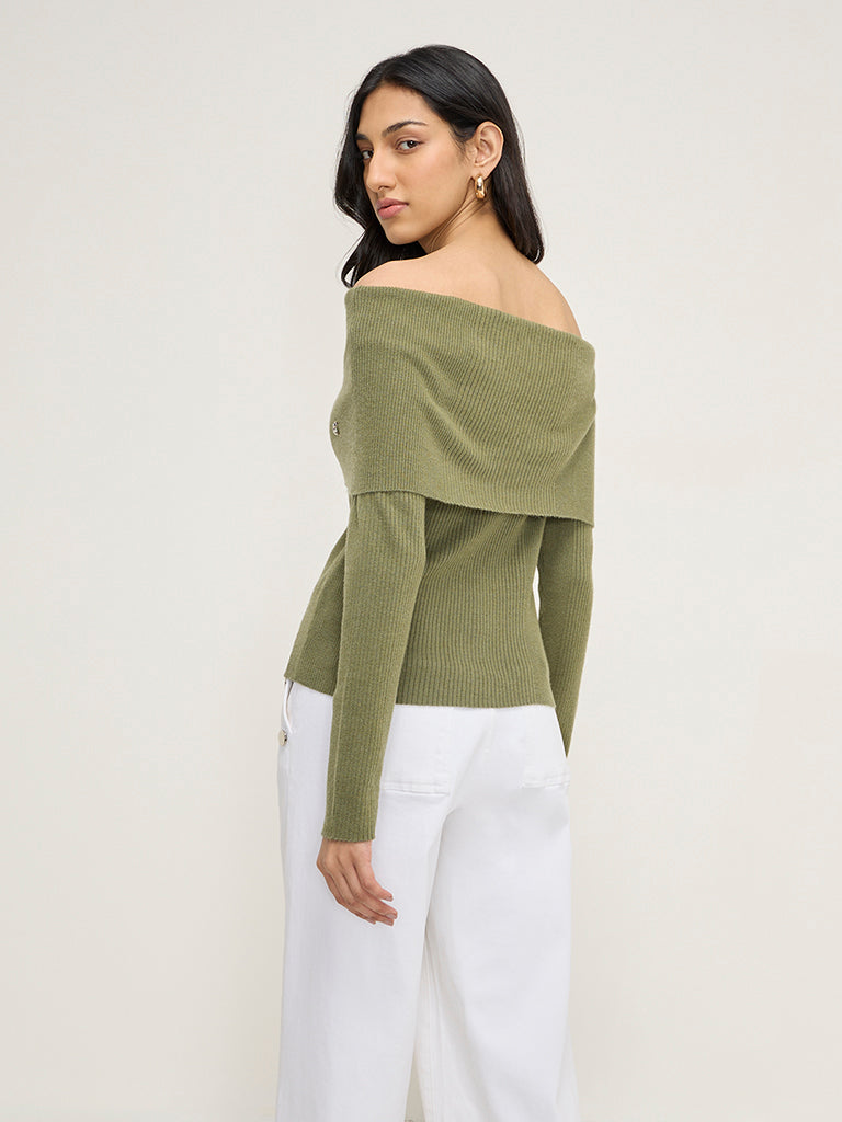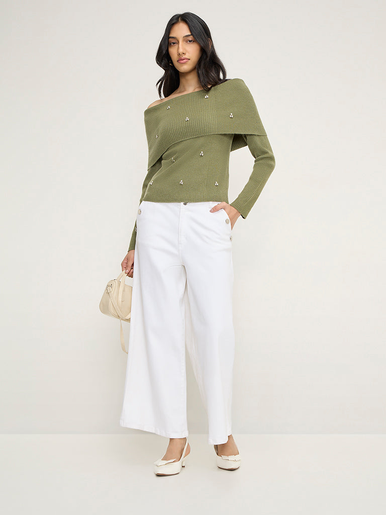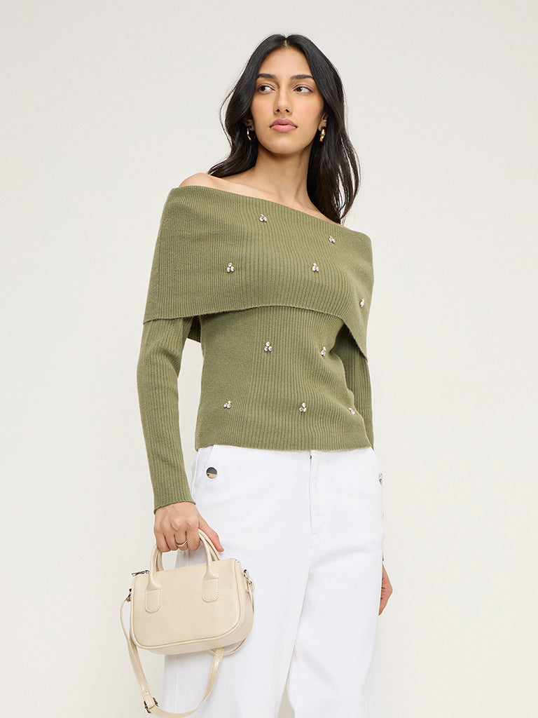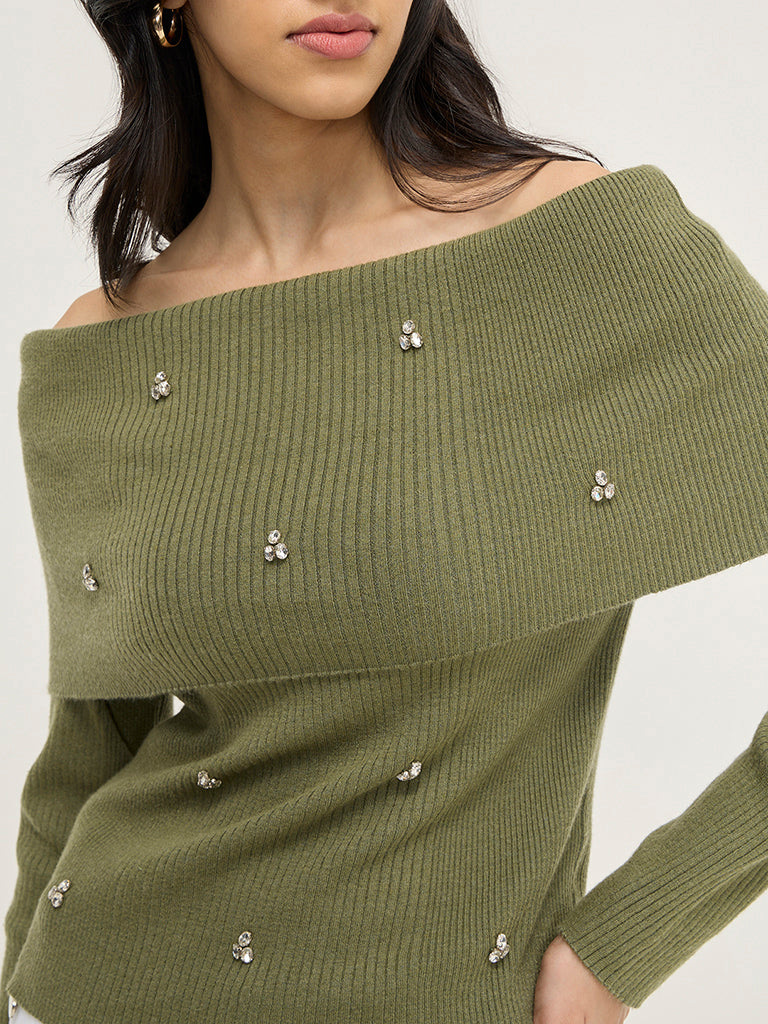 This olive top from LOV is fashioned from a ribbed-textured fabric with diamant?? embellishments. It features an off-shoulder neckline and long sleeves for a sumptuous feel.