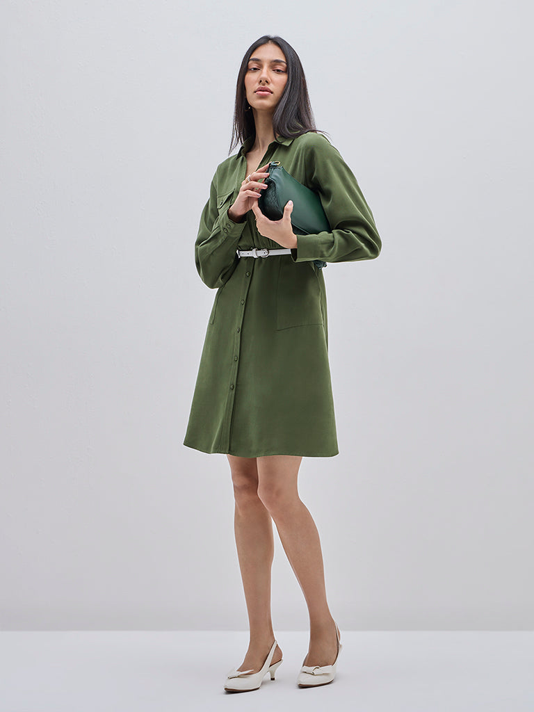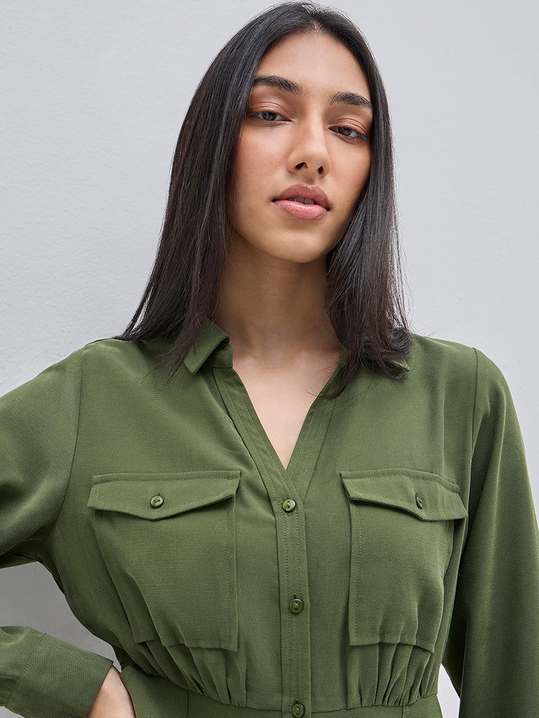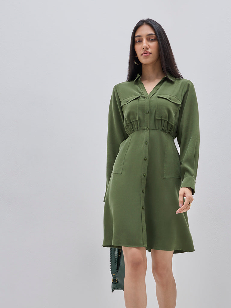 This olive dress by LOV offers a fit and flare silhouette. Crafted in quality fabric. it boasts a notched collar. full sleeves and button down style. The smocked detailing at the waistline and multiple pockets complete this elegant dress.