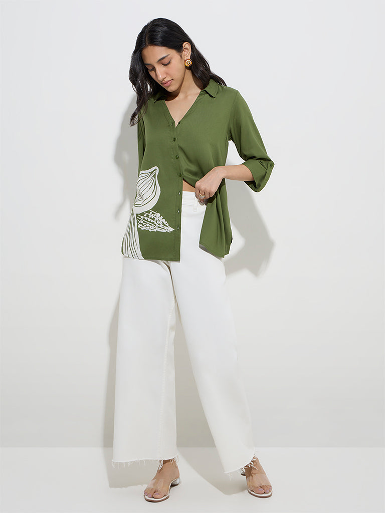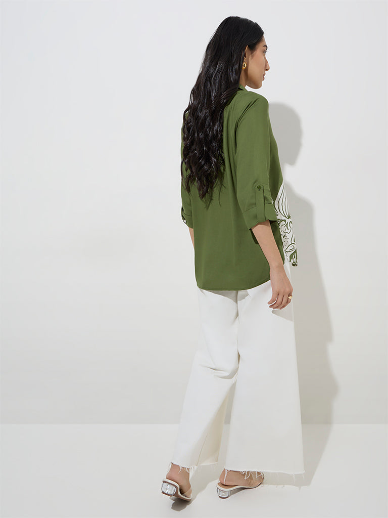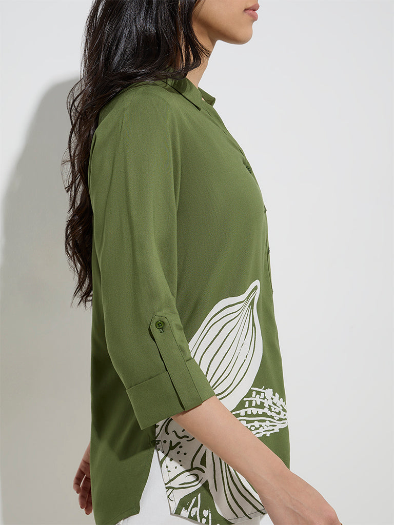 This olive shirt from LOV is decorated with delicate floral motifs. Crafted from premium fabric. it features a V-neck collar. a button-down front. and three-quarter sleeves for a refined yet effortless look.
