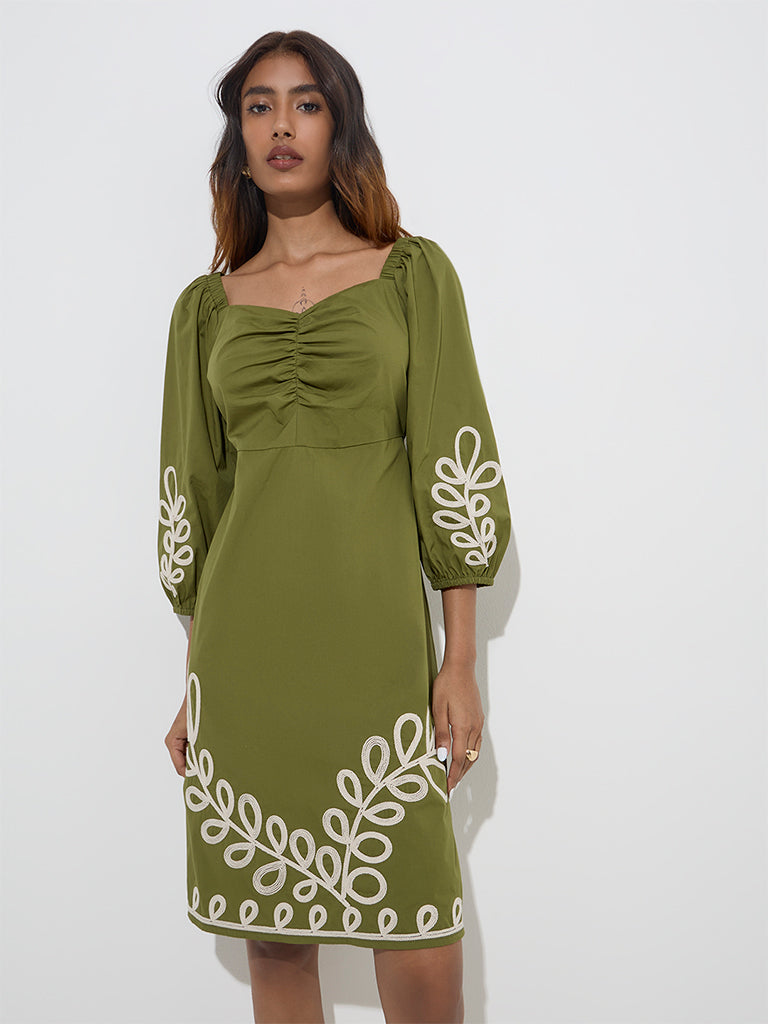 LOV Olive Foliage Embroidered Cotton A-Line Dress