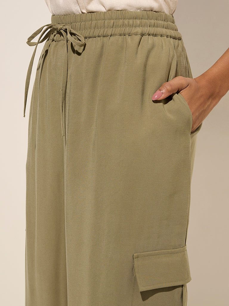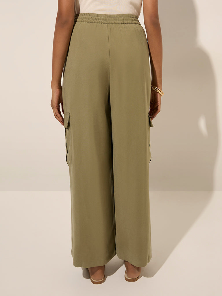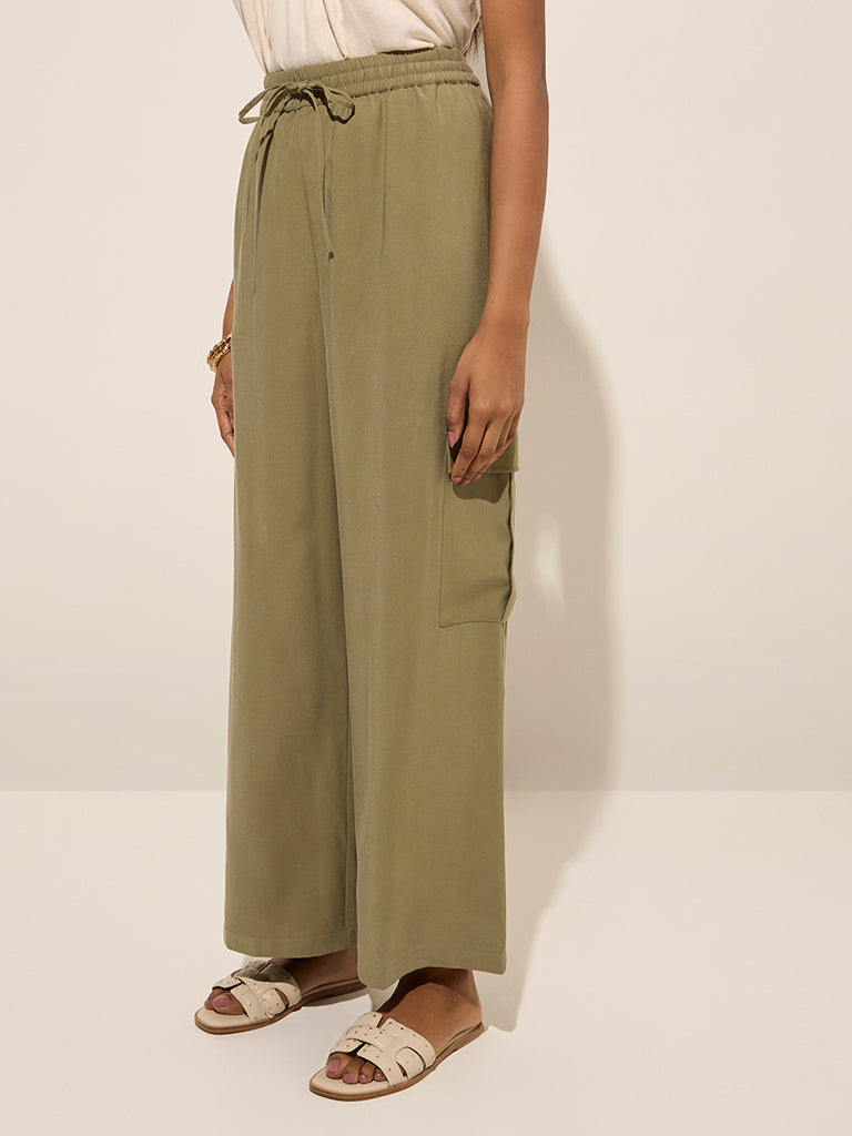 LOV introduces these olive cargo pants. designed for both comfort and style. Crafted from high-quality fabric. they feature an elasticated waist with an attached drawstring for a customizable fit. along with multiple pockets for added functionality.