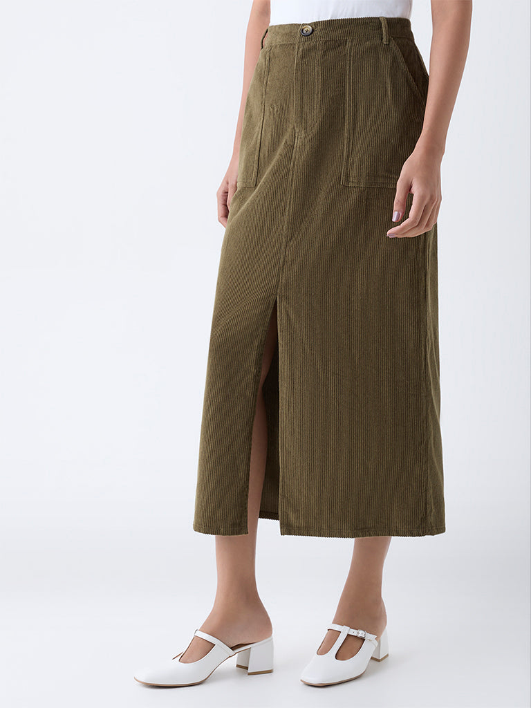 This olive skirt from LOV is tailored in corduroy for a look that feels both structured and wearable. Front pockets and a centre slit balance function with femininity. while the buttoned waistband lends a clean finish. Belt loops add styling potential. letting you refine the silhouette with your choice of accessory.