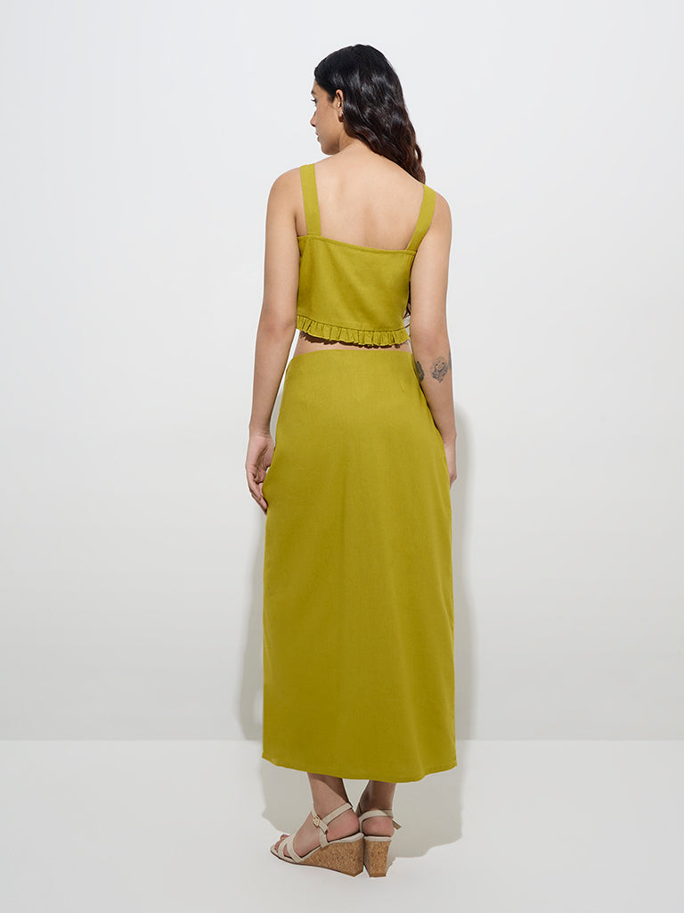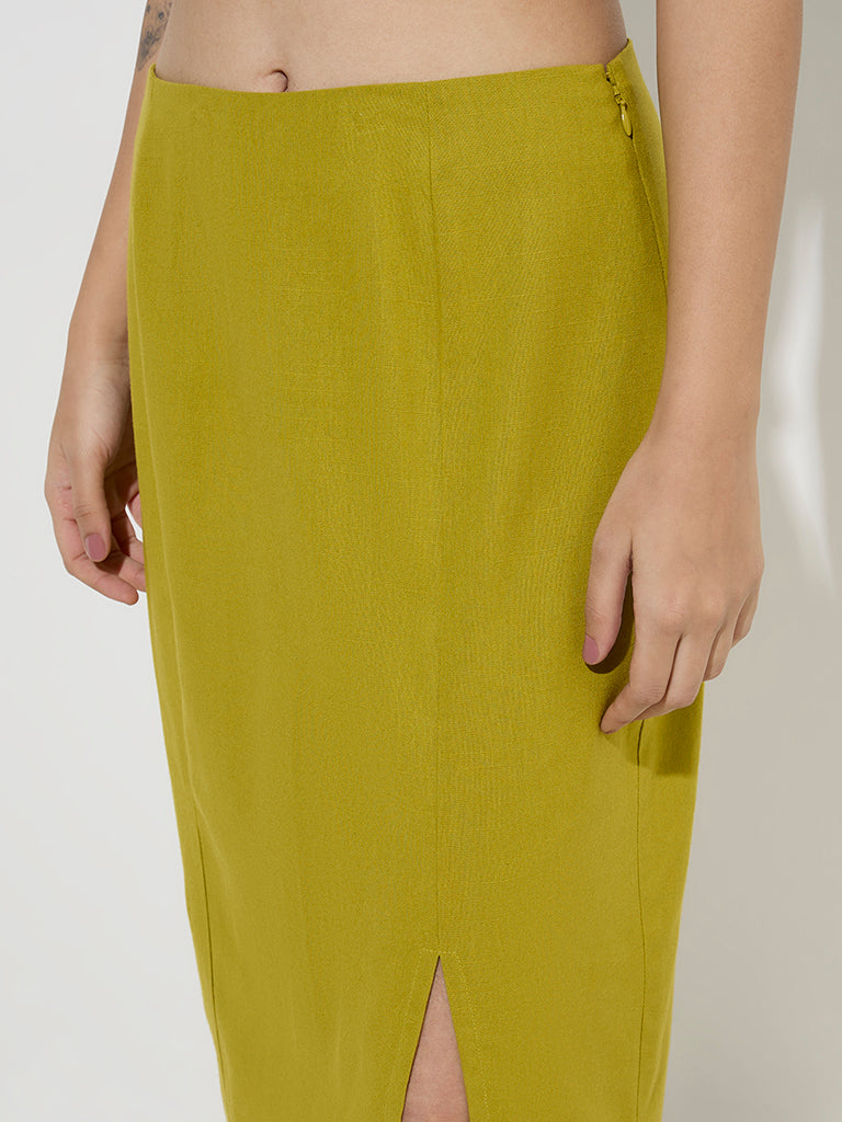 This olive skirt from LOV features a front slit for a chic. modern touch. Milled from a luxurious cotton-blend fabric. it is designed with an elasticated waistband and a secure zipper closure. ensuring a comfortable fit and effortless wearability.