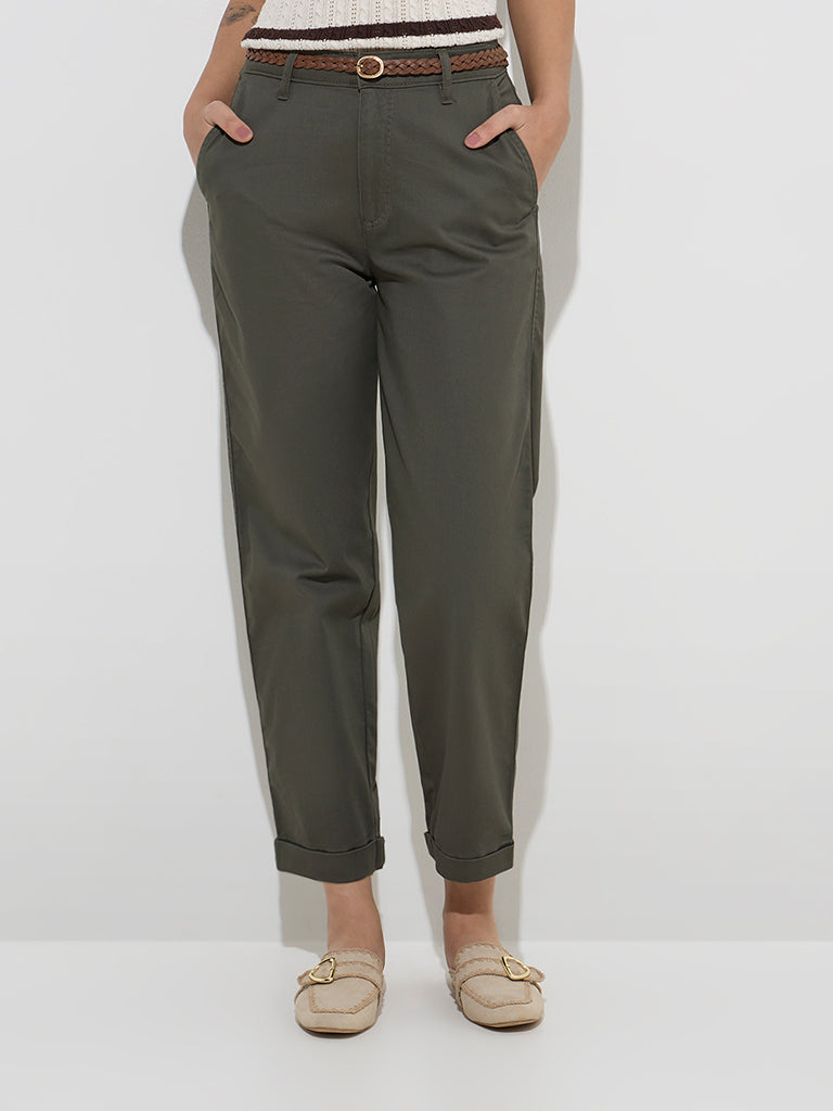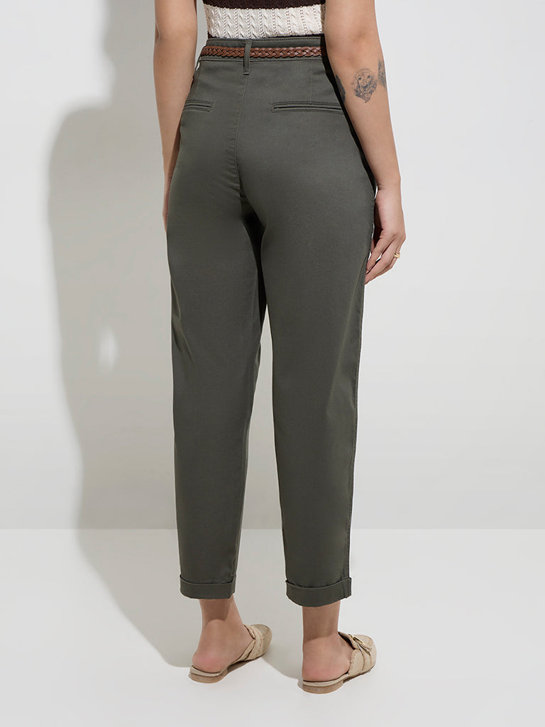 LOV Olive High-Rise Cotton-Blend Trousers