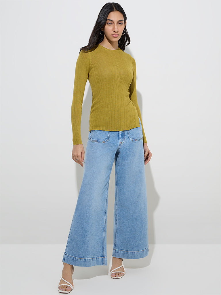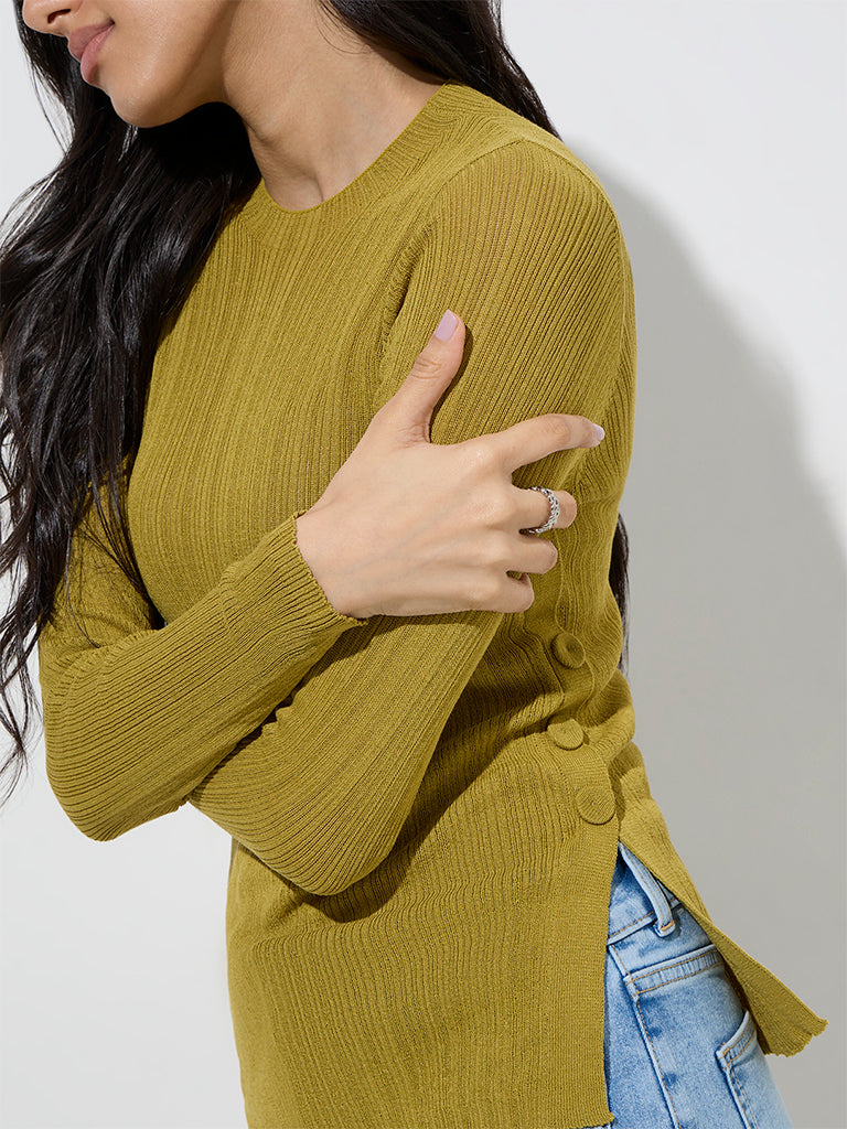This olive top from LOV is tailored in a ribbed profile for a sleek yet comfortable fit. Designed with a crew neck and full sleeves. it is accented with button detailing at the sides for a refined touch of style.