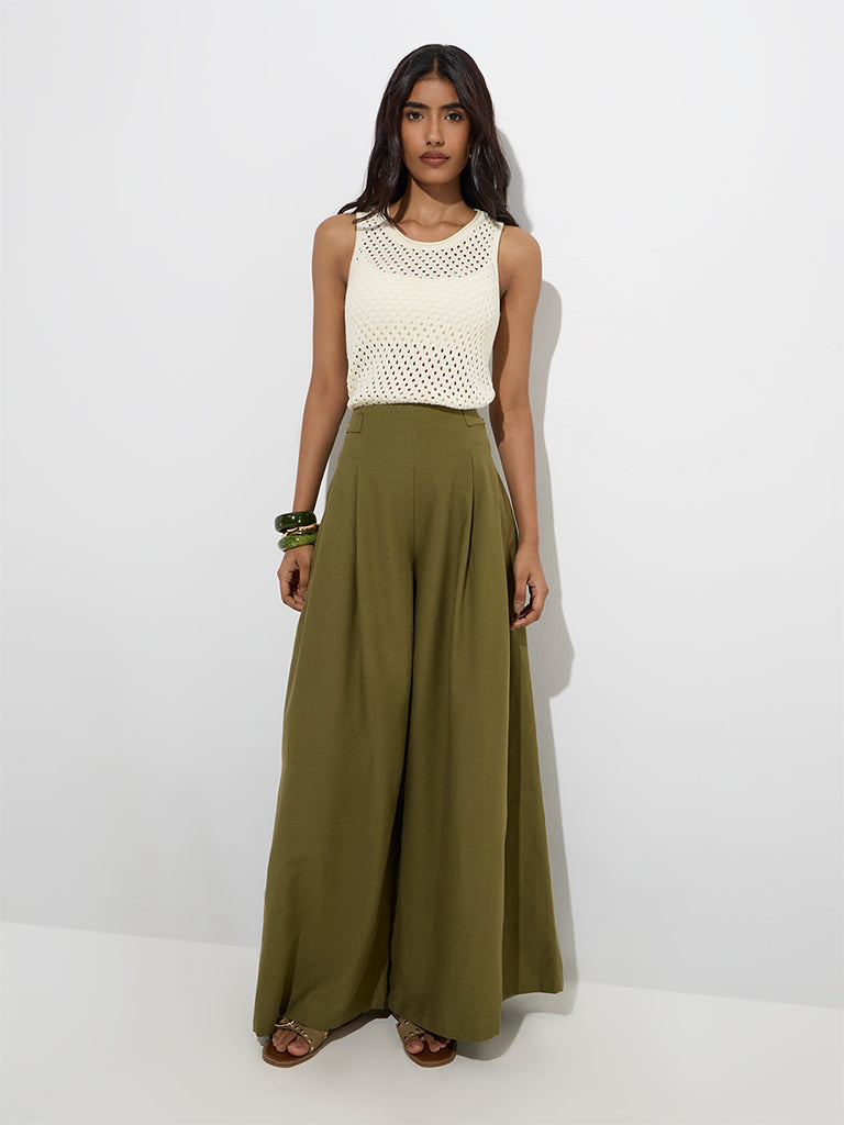 LOV Olive Wide-Leg High-Rise Cotton-Blend Pants