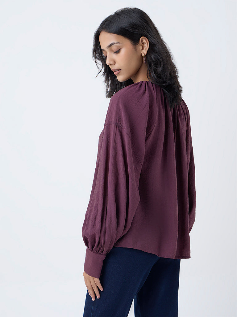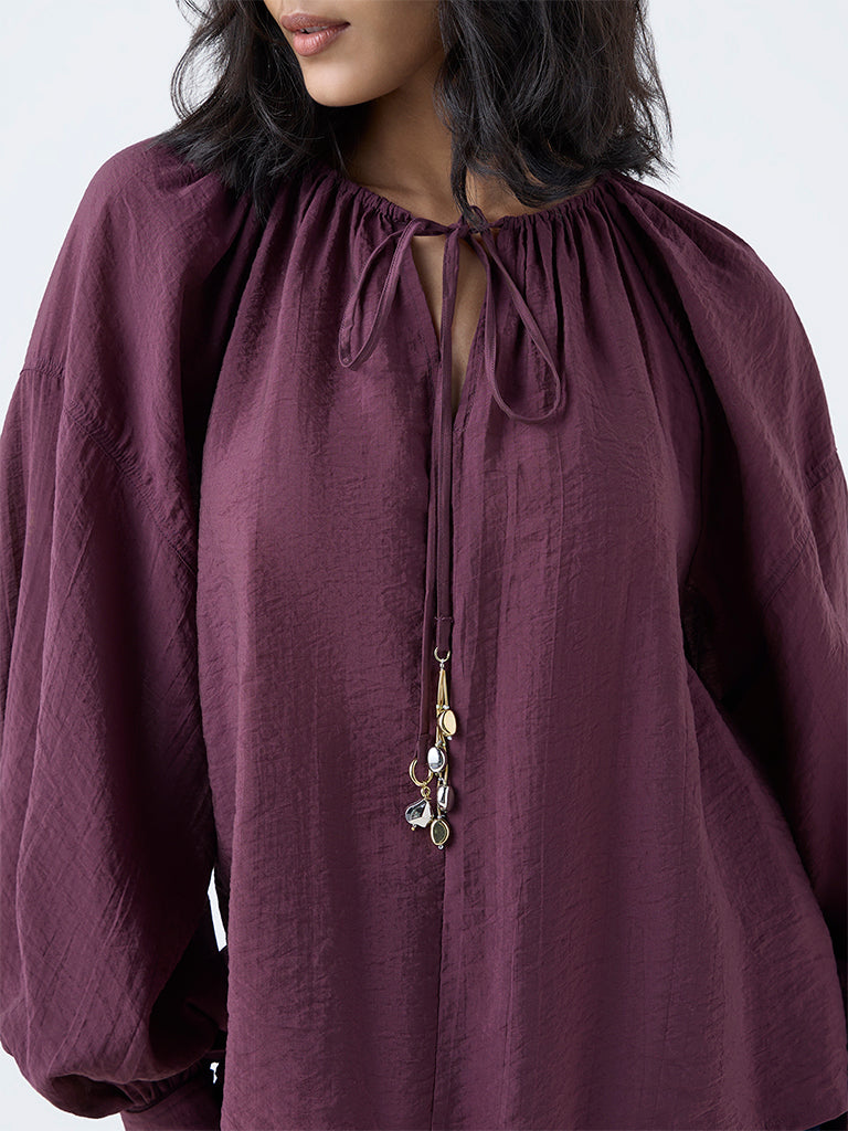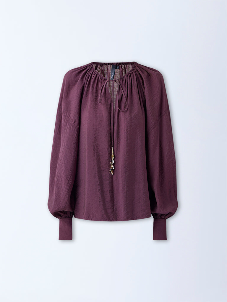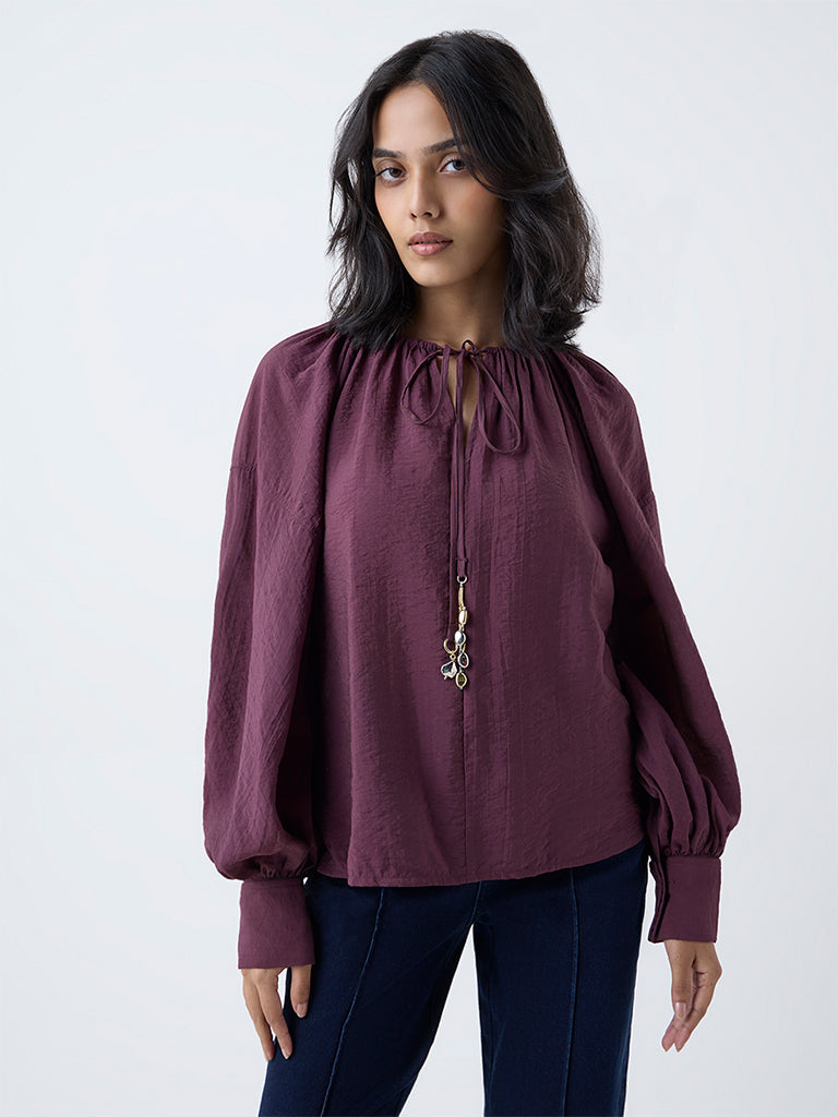 Revamp everyday dressing with this plum top from LOV. It features bishop sleeves and a split neckline finished with drawstring ties and gold-toned charms. Crafted from breathable fabric. it feels smooth and lightweight on the skin. offering effortless elegance for day or evening wear.
