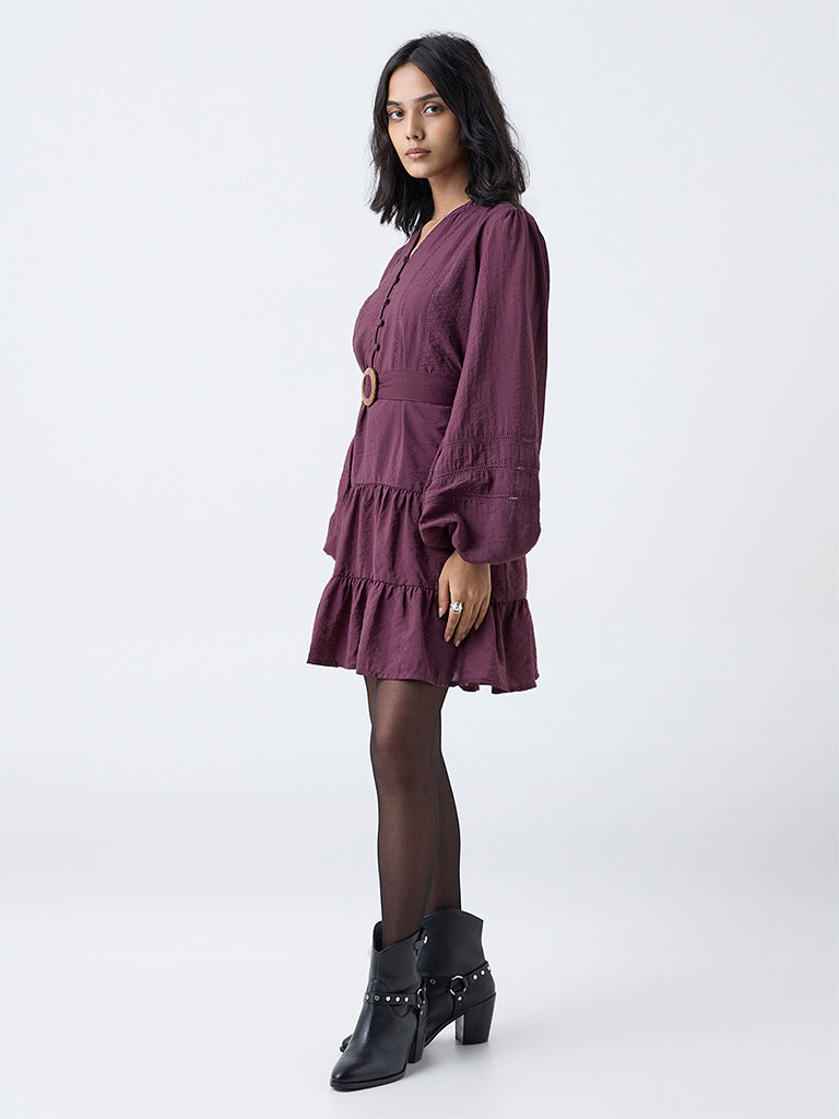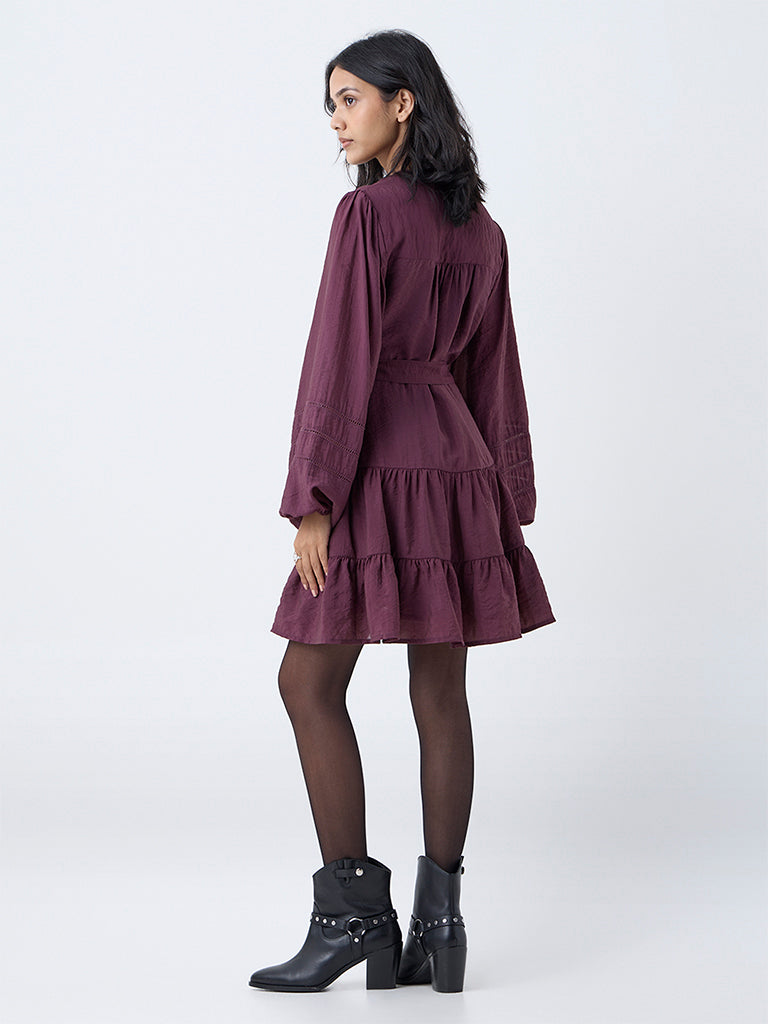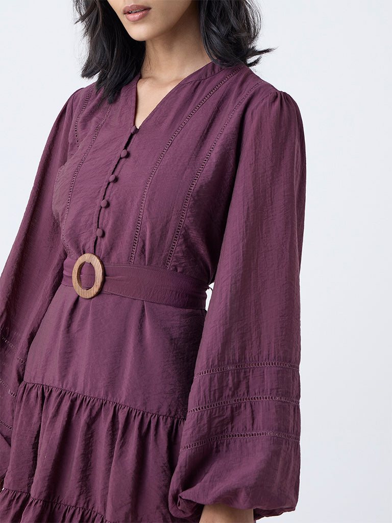 Graceful and feminine. this plum dress from LOV is crafted from lightweight fabric that drapes beautifully in a tiered silhouette. The lace-detailed bodice. v-neckline. and balloon sleeves lend soft texture. while the matching belt defines the waist for a balanced shape. An elegant pick for warm days and easy occasions.
