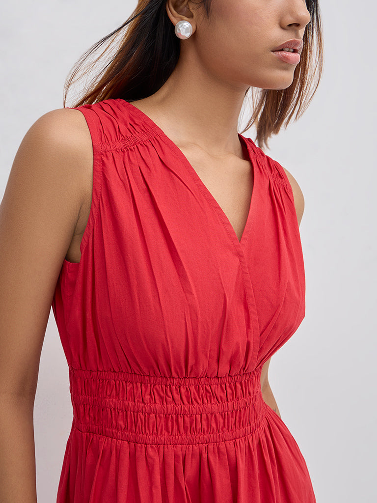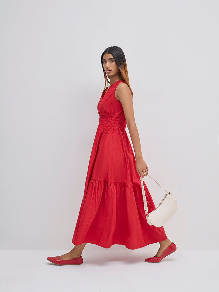 LOV brings you this red dress in timeless tiered detailing. The garment is carved in a smocked fit and flare silhouette with soft and breathable fabric composition. It carries a sleeveless cut featuring a gathered design. a V-neck and side pockets.