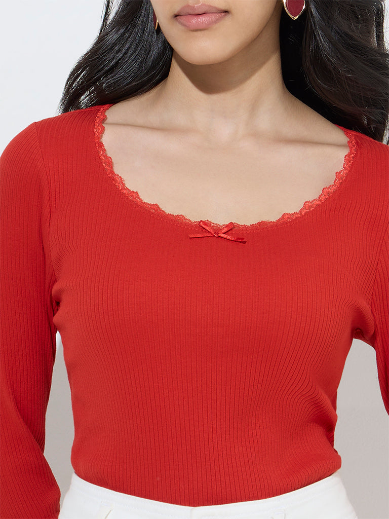 This red top from LOV features a ribbed texture and a soft bow detail for a feminine flair. Crafted from a cotton-blend fabric. it has a scoop neck with lace accents and full sleeves. offering a stylish and comfortable fit.