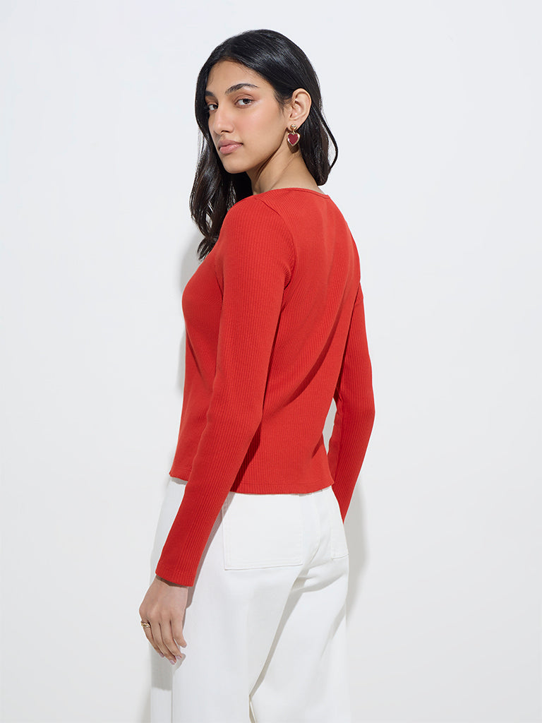 LOV Red Ribbed-Textured Cotton-Blend Top