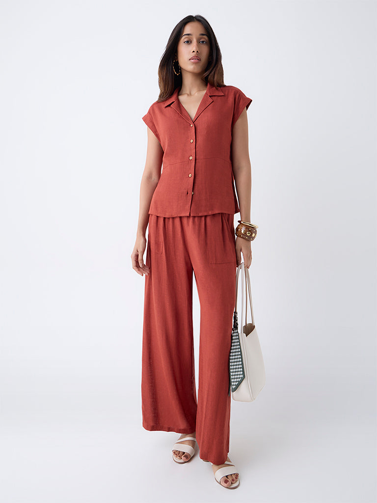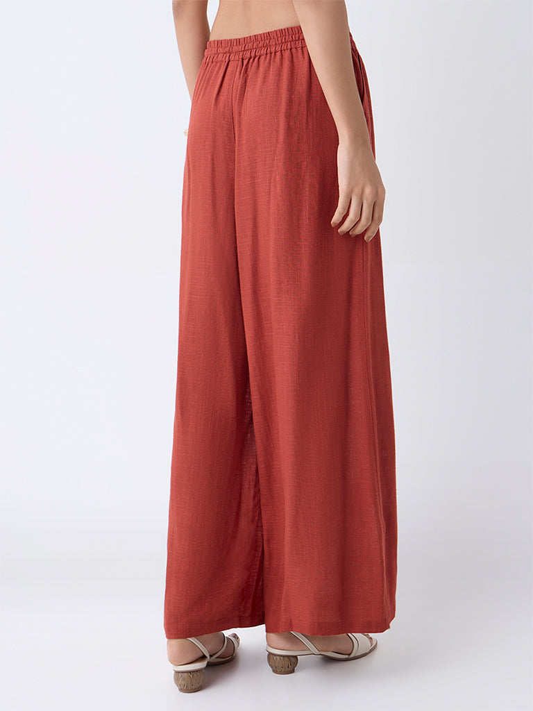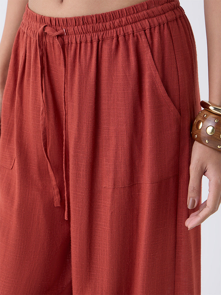 LOV launches these rust trousers made from a sumptuous fabric that delivers a lightweight feel. Framed in a high-rise waist. it is fitted with an elasticated waist and adjustable drawstrings for a secure fit. Finished with side pockets for functionality. this pair is a versatile addition to casual wardrobes. ensuring comfort without compromising on style.