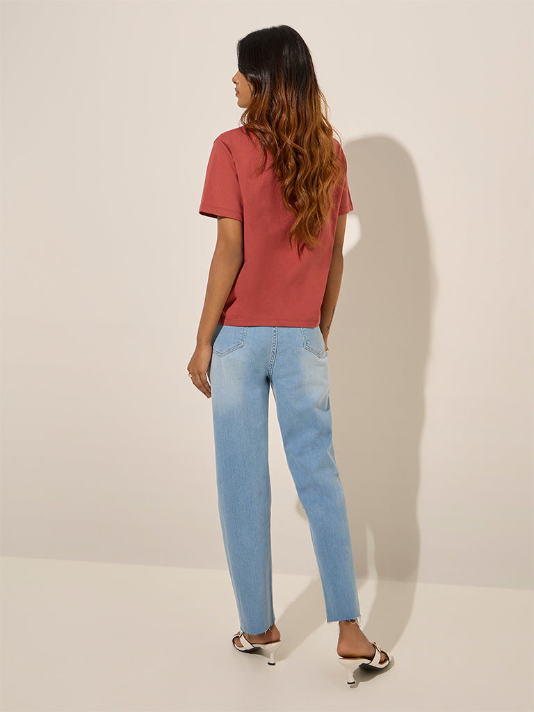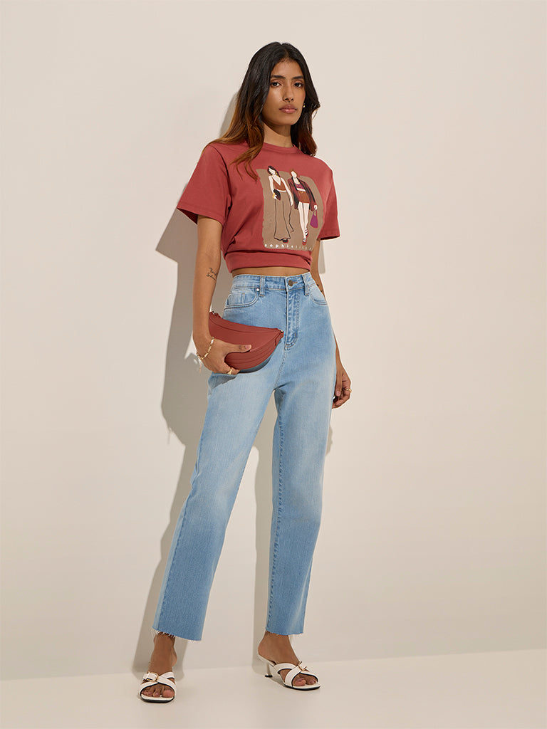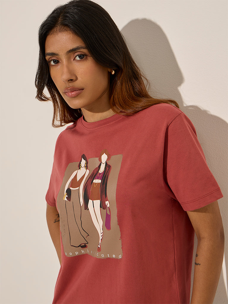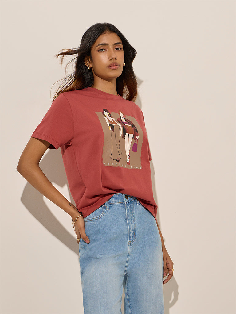 LOV introduces this t-shirt in a rust shade. showcasing female motifs. Created from pure-cotton. it is fitted with a round neck and short sleeves.