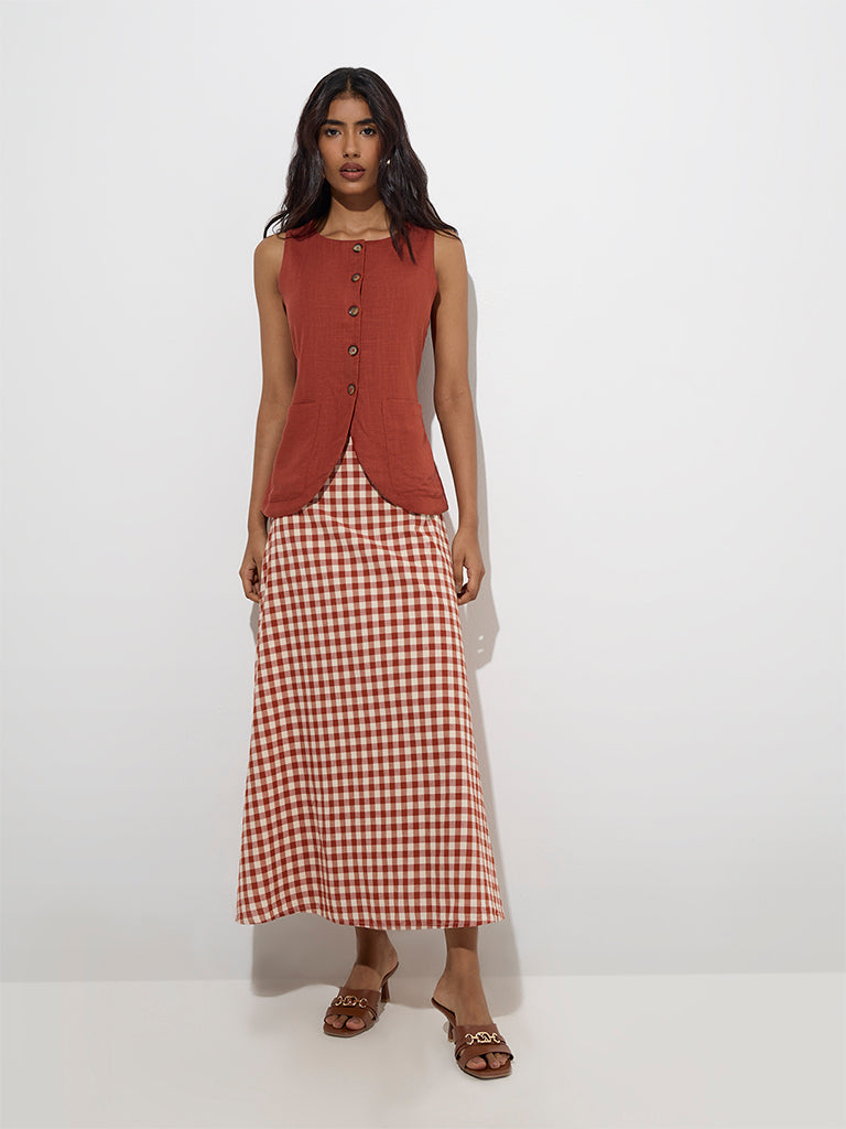 LOV introduces this rust waistcoat-style top as a refined layer for summer days. Cut from a lightweight fabric in a minimal silhouette. it features a round neck that extends to a button placket and a sleeveless cut that channels effortless polish. Finished with dual pockets. it’s the kind of piece that pairs just as easily with tailored trousers as it does with weekend denim.