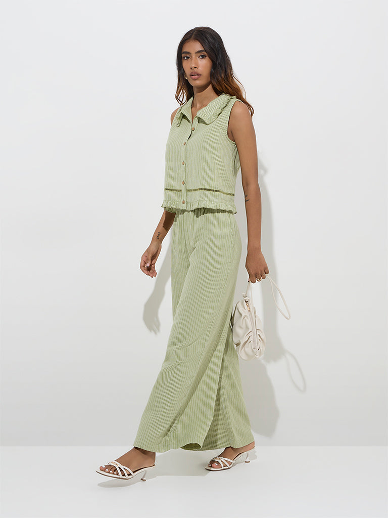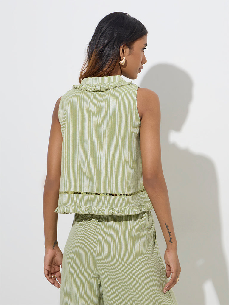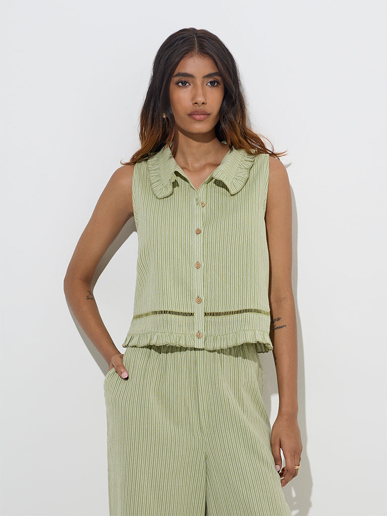 Milled from a soft cotton-blend fabric. this sage top from LOV showcases classic stripes for a timeless appeal. Designed with a ruffled collar that extends into a button placket. it is finished with a delicate ruffled hem for an elegant touch.