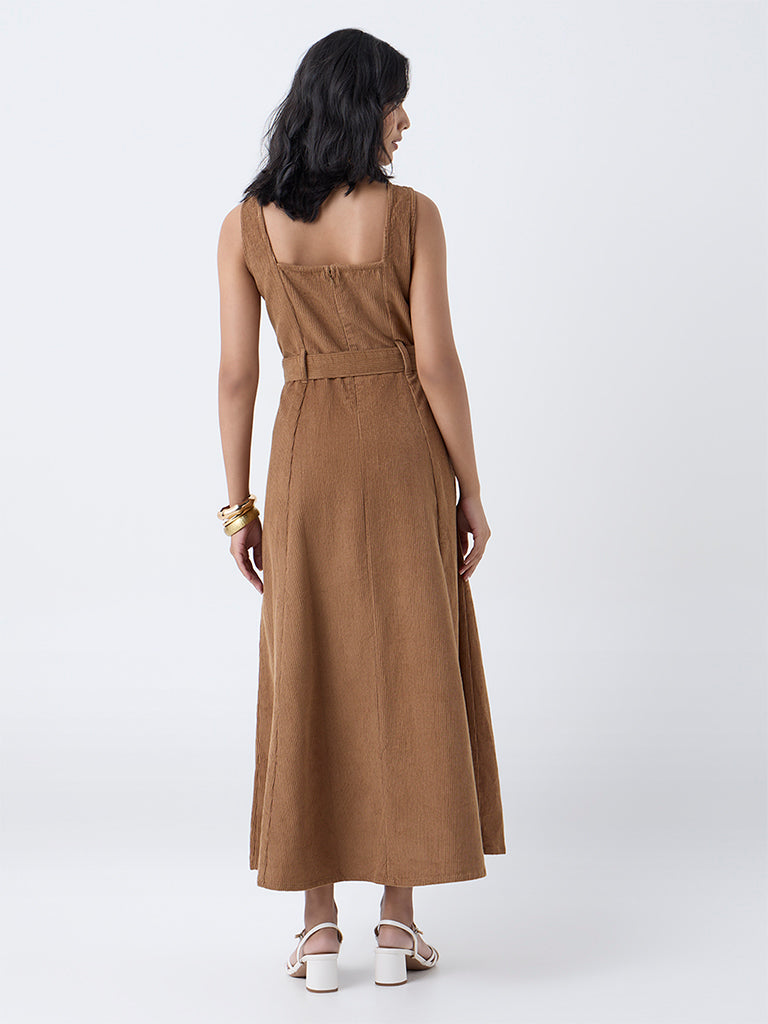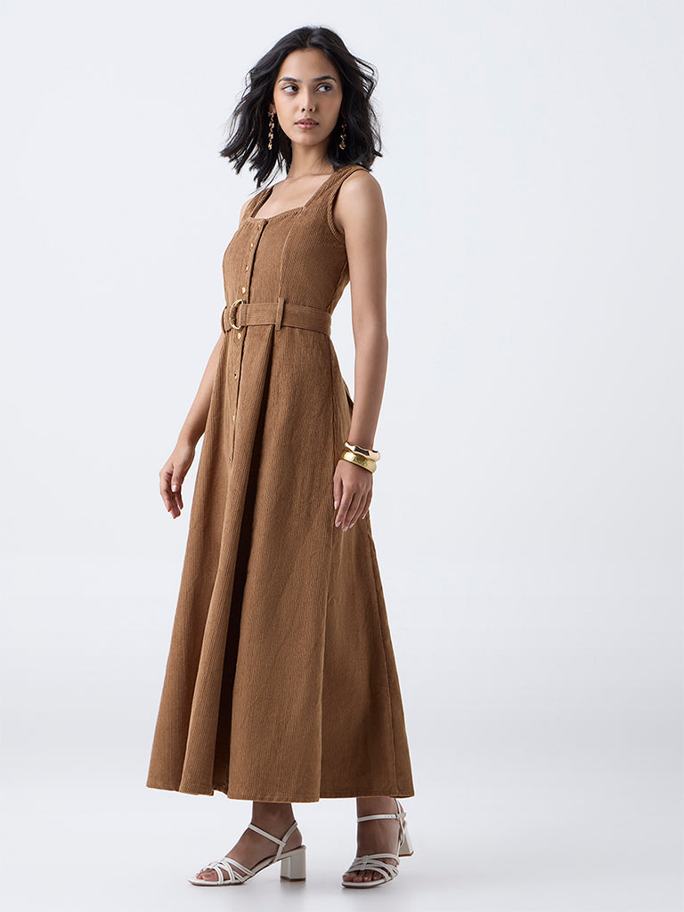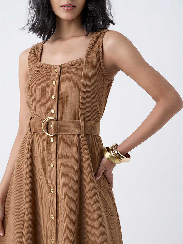 Soft structure meets subtle texture in this tan corduroy dress from LOV. Sculpted in an A-line silhouette with a square neckline and button-up front. it offers an airy. sleeveless profile ideal for transitional weather. The coordinated belt with a gold-toned buckle cinches the waist. adding definition to its clean. contemporary shape.