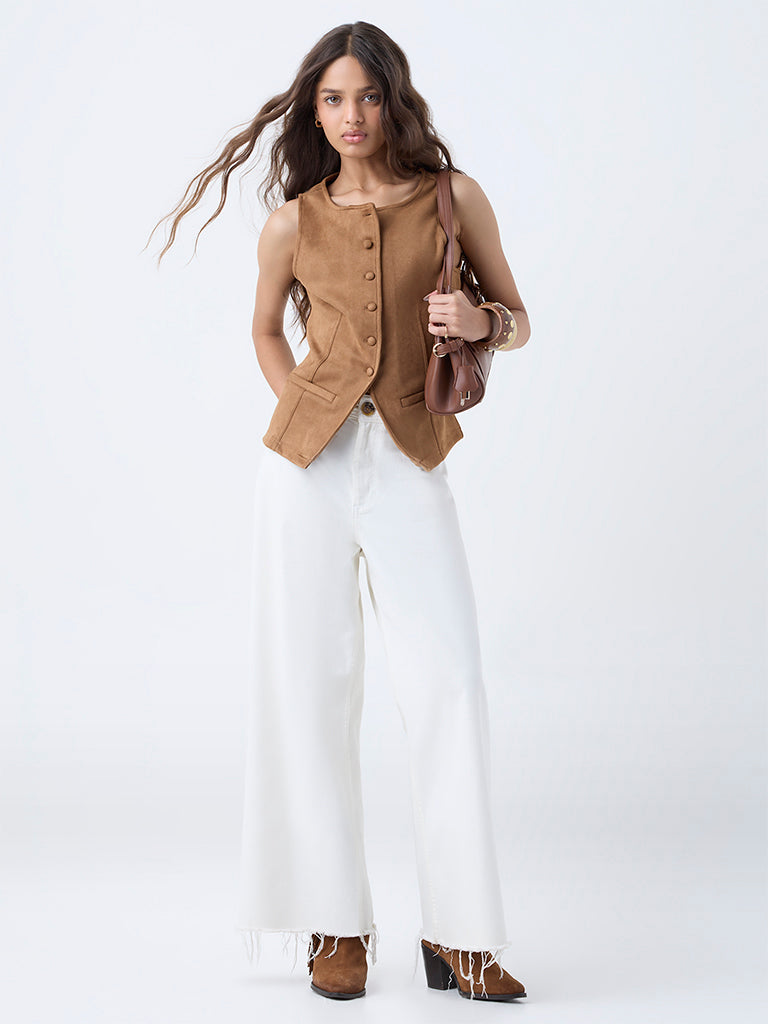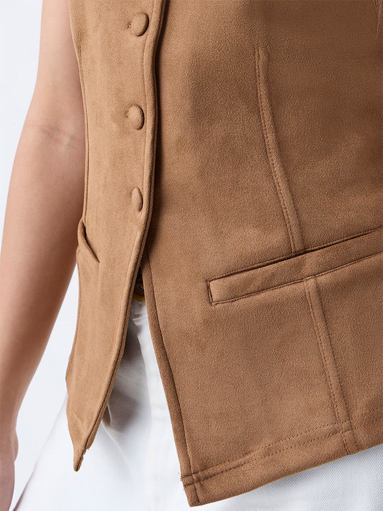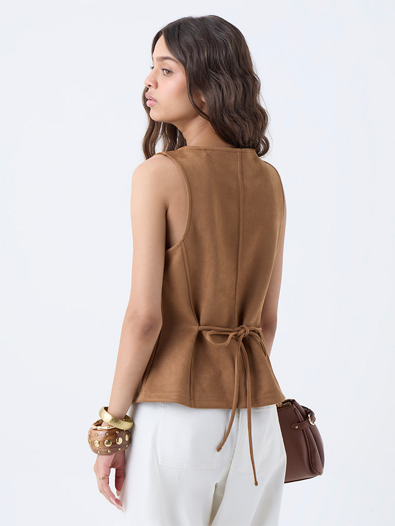Chic yet versatile. this tan waistcoat from LOV brings a touch of texture to your wardrobe. Crafted from supple faux suede. it features a round neck. button placket. and sleek welt pockets that lend a tailored edge. The adjustable tie-up detail at the back ensures a flattering fit that works beautifully over shirts or dresses alike.