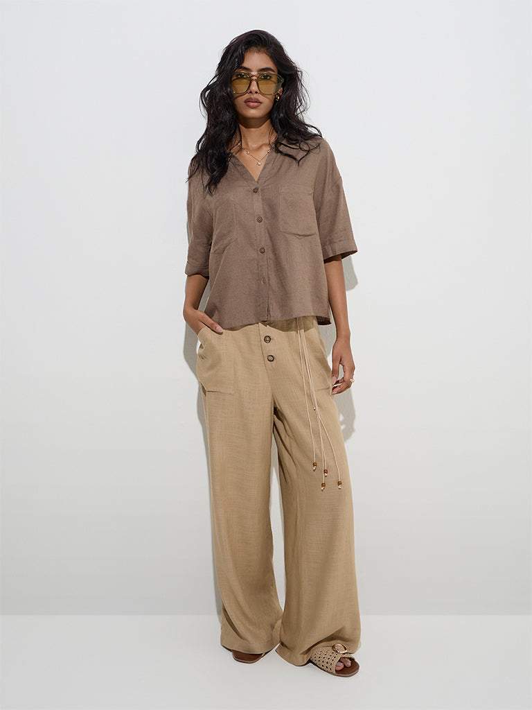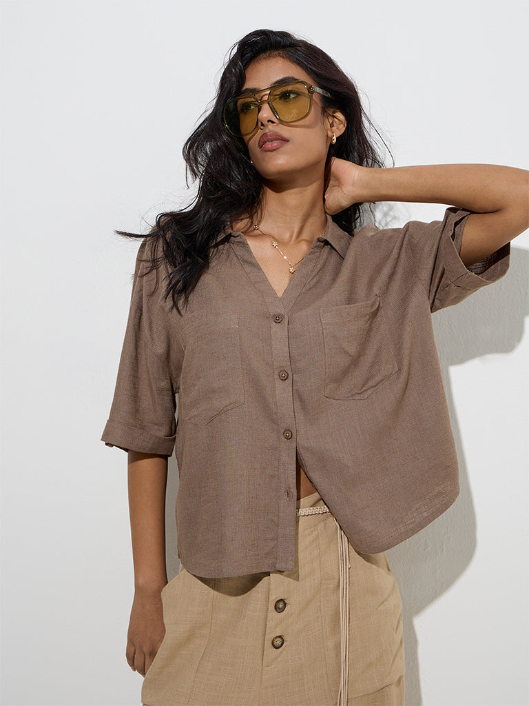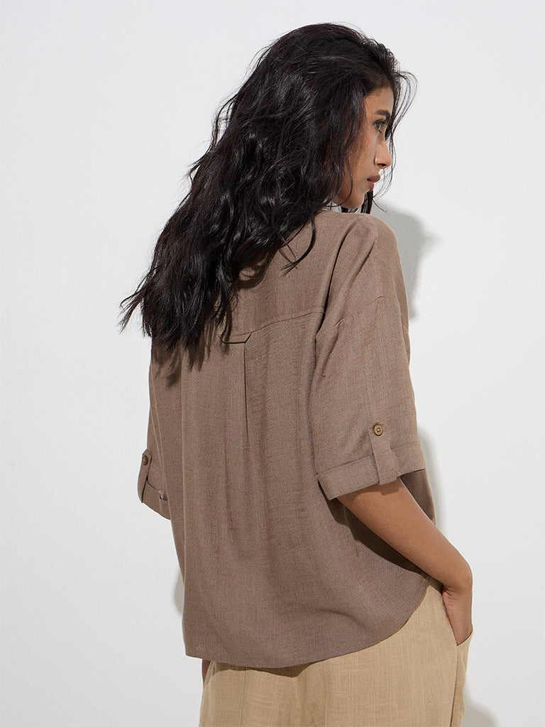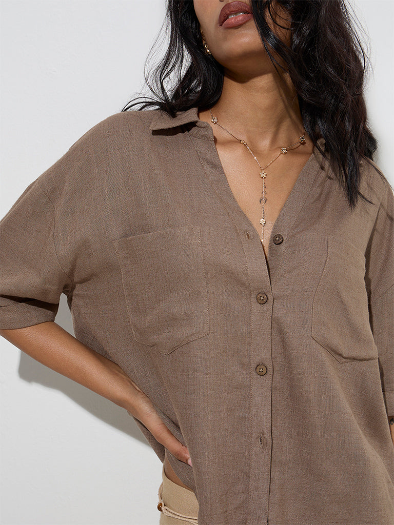 This taupe shirt from LOV blends utility with understated elegance. Cut from a premium linen-blend fabric. it features a relaxed silhouette with drop-shoulder sleeves and front patch pockets for a hint of structure. The V-neck collar and tonal button-down front lend a polished finish. making it a versatile pick for work or weekend styling.