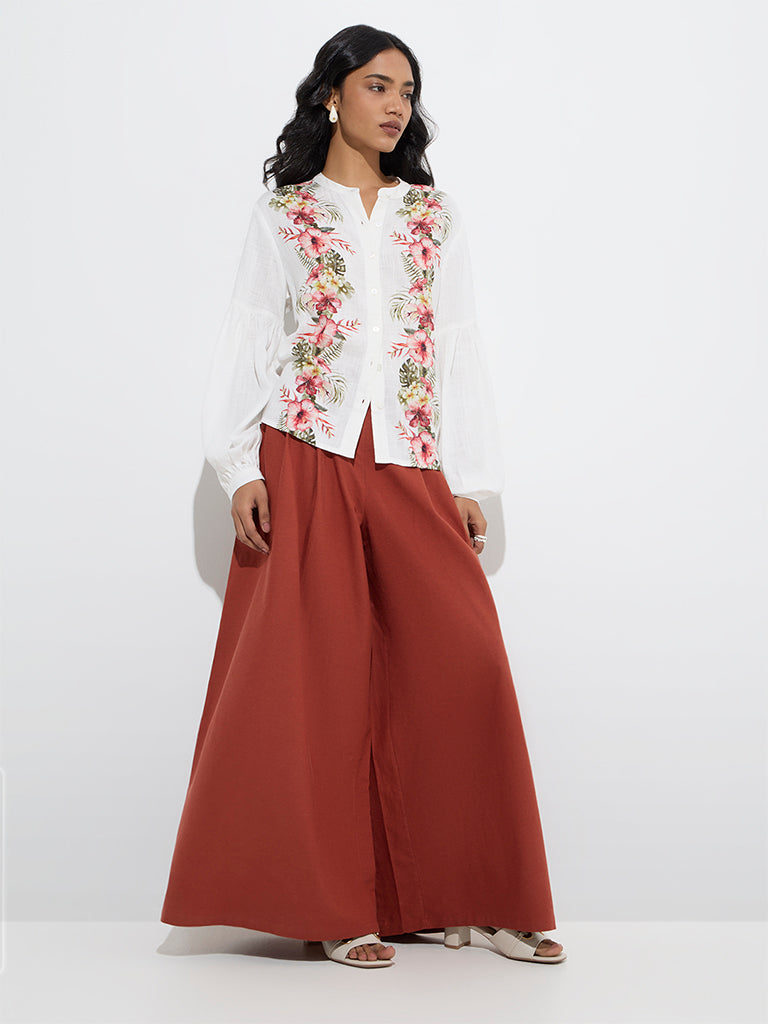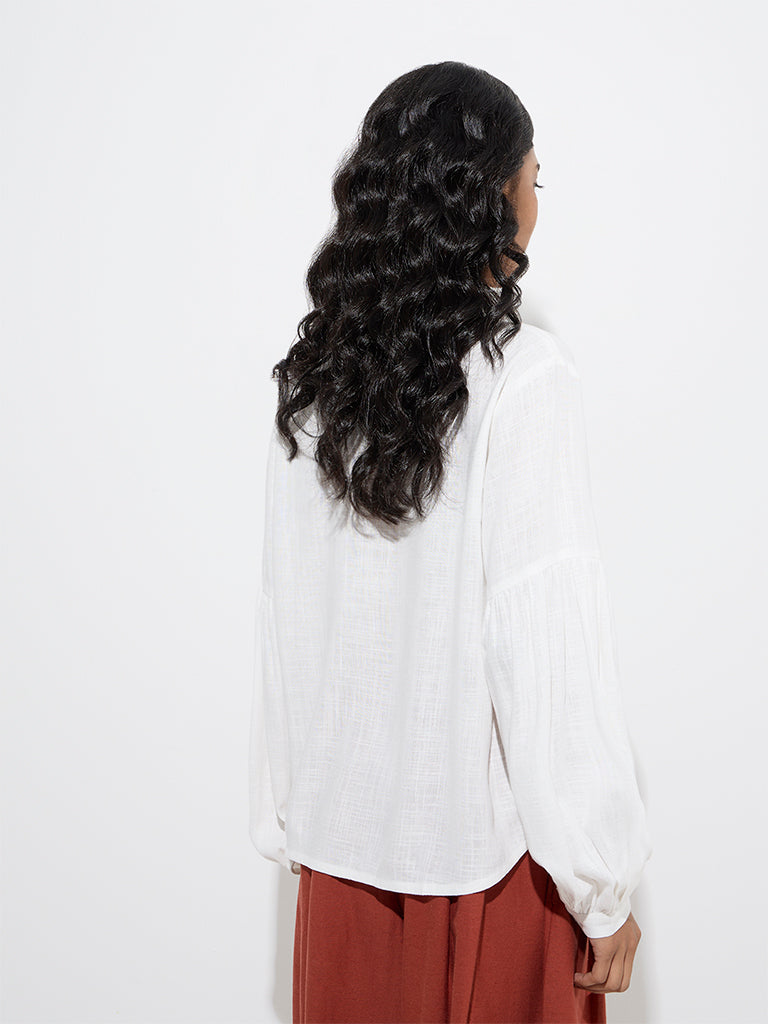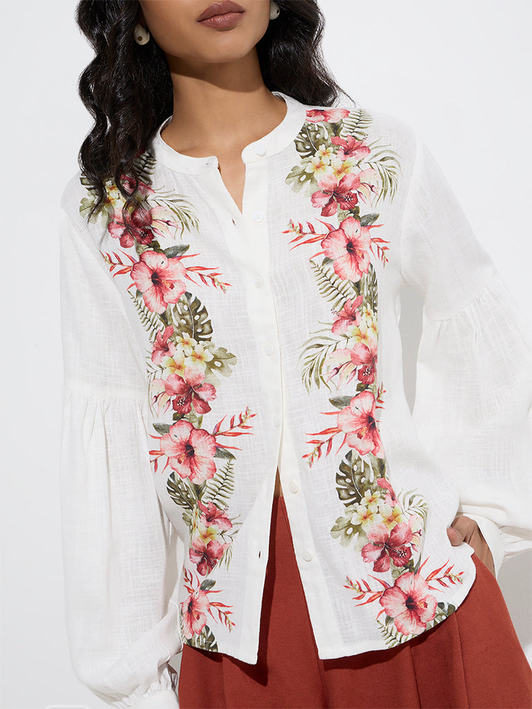 Effortlessly feminine and easy to style. this white blouse from LOV is a versatile wardrobe staple. Showcasing graceful botanical prints on a premium linen-blend fabric. it features a band neck that flows into a button placket and is finished with voluminous balloon sleeves.