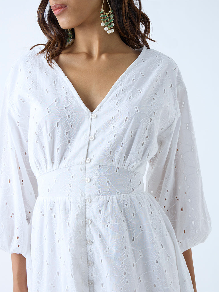 Make an effortlessly chic statement in this white dress from LOV. Styled in an A-line silhouette for graceful movement. it is framed with a V-neck. a button-up front and blouson sleeves. Spun from pure cotton fabric with broderie anglaise patterns. it is perfect for summer outings and daytime brunches.