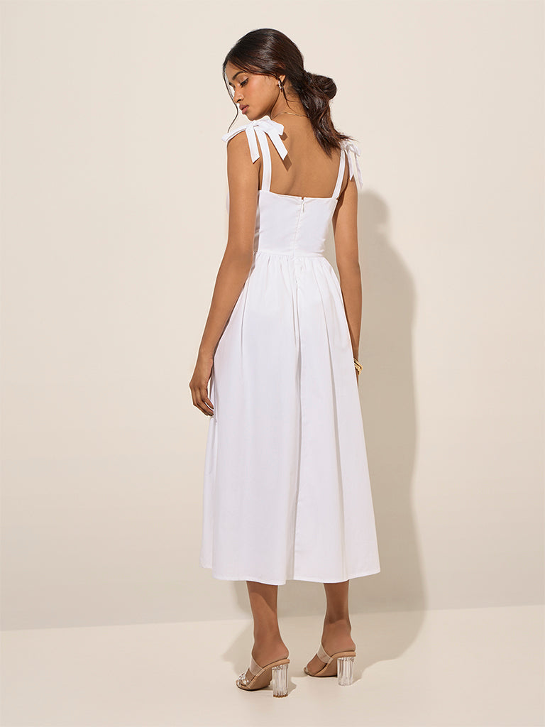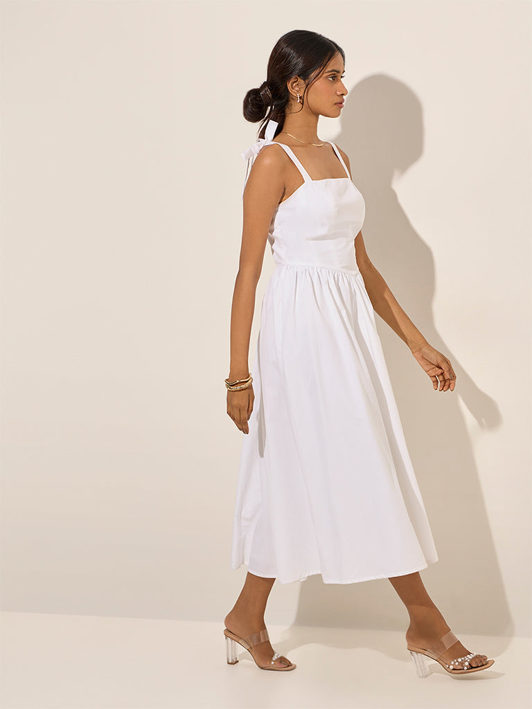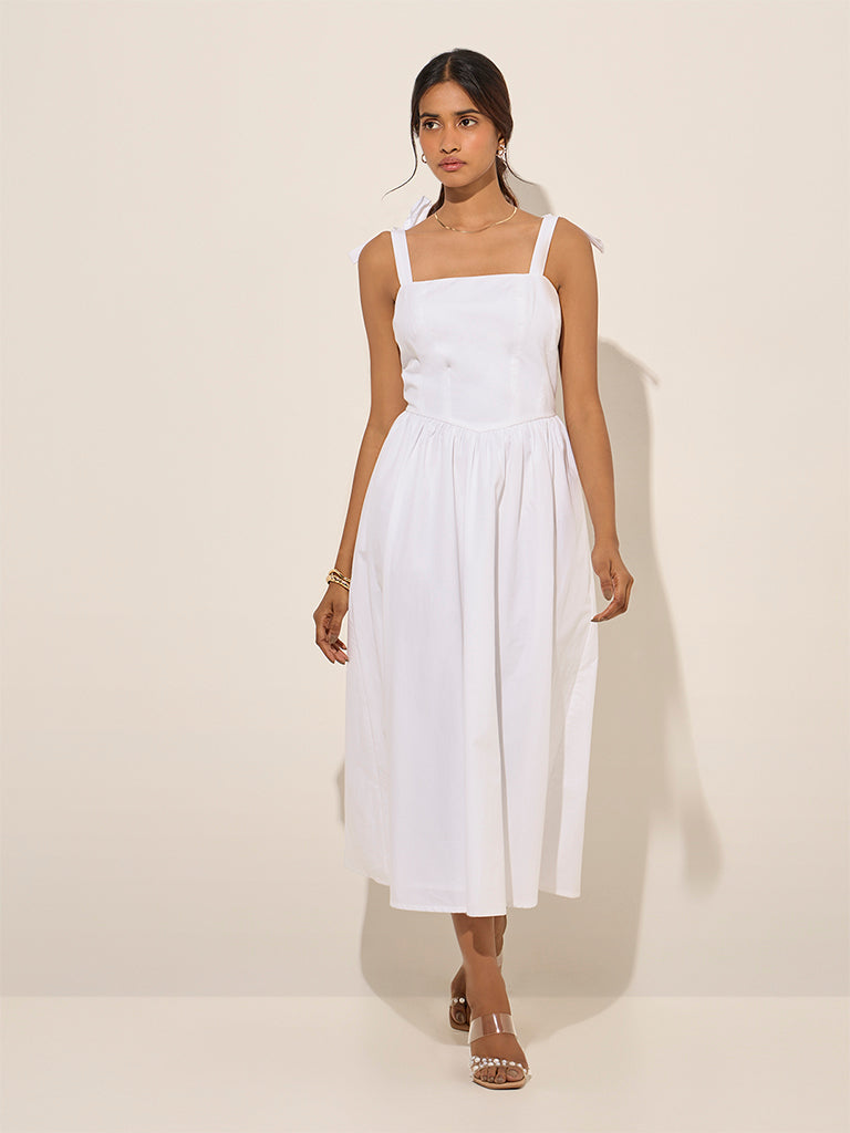 This white dress from LOV features a structured square neck and tie-up shoulder straps for a stylish touch. Crafted from a cotton-rich fabric. it offers comfort and breathability. while the back zipper closure ensures a perfect fit.