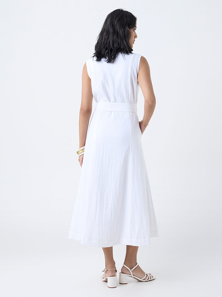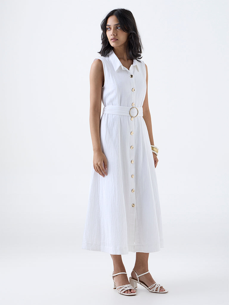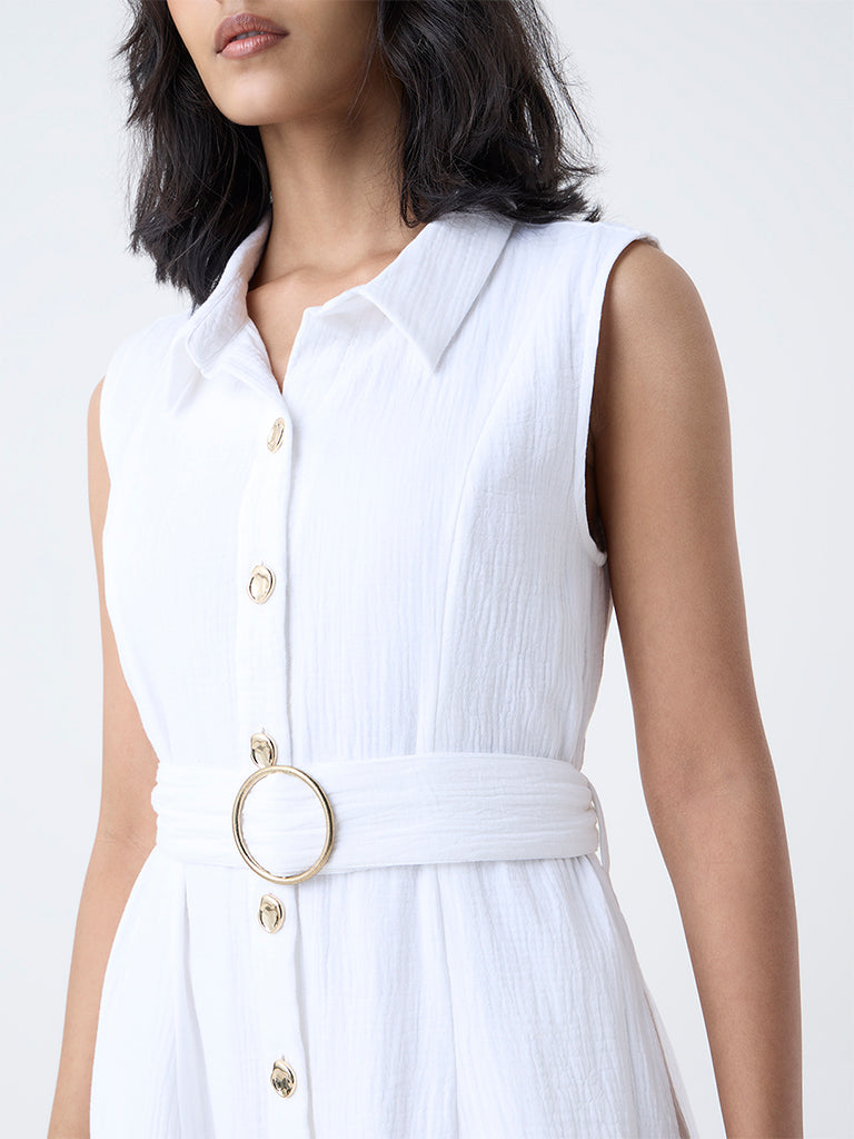 LOV White Crinkle-Textured Cotton Shirt Dress