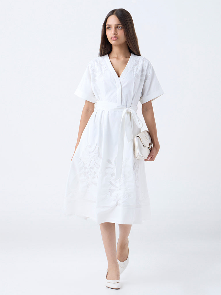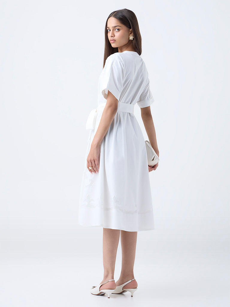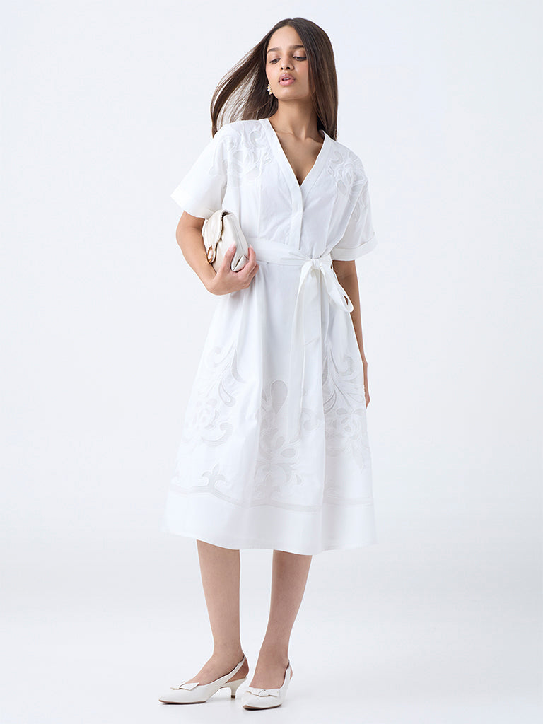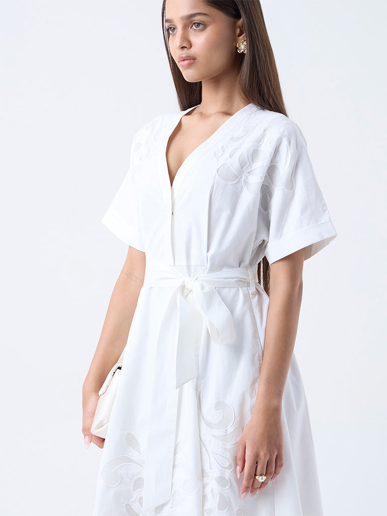 LOV White Embroidered Cotton A-Line Dress with Belt