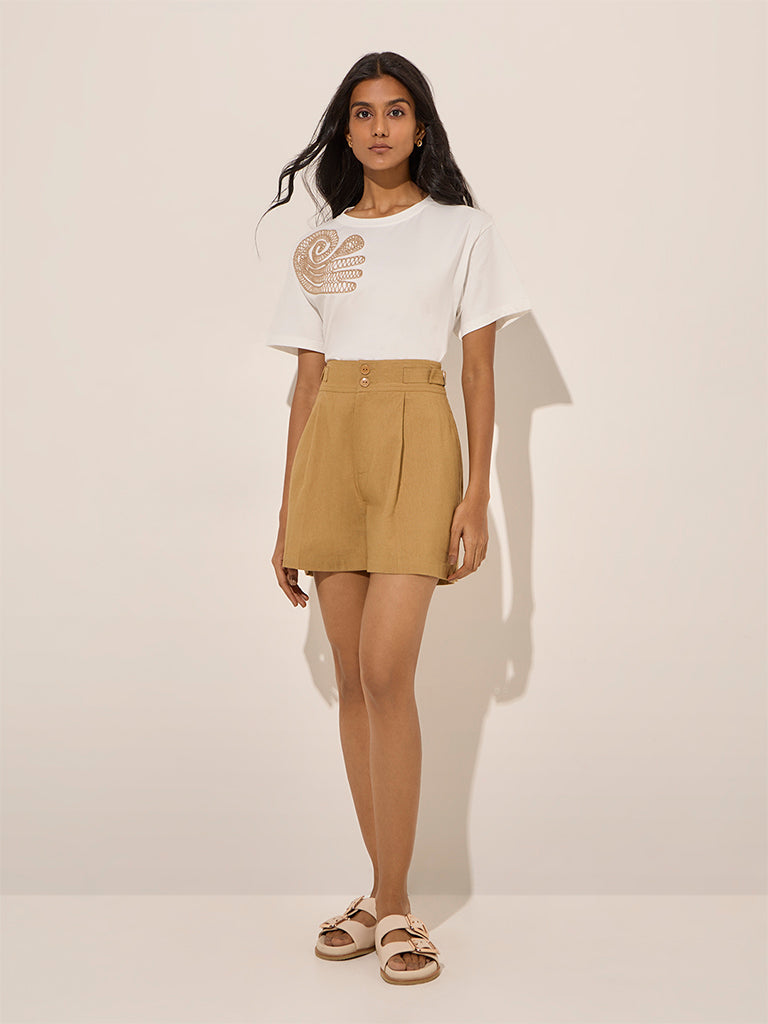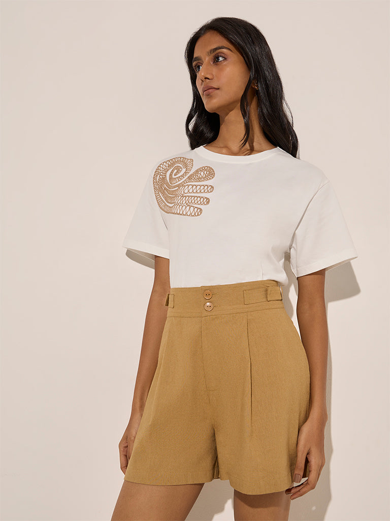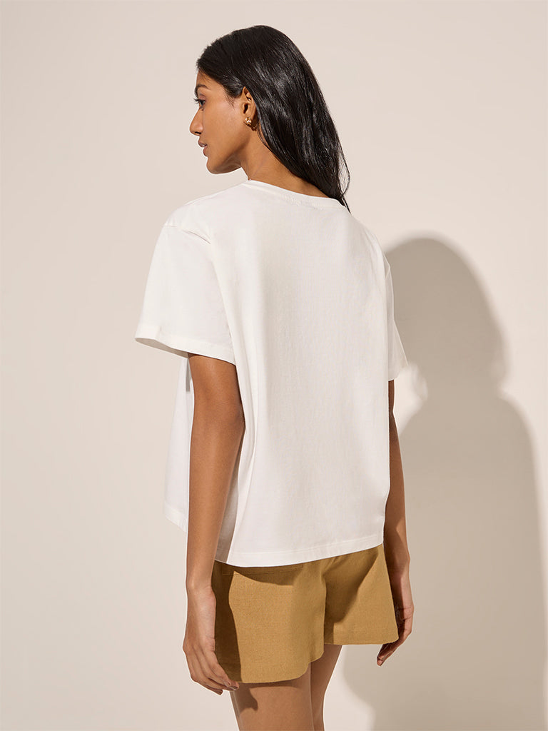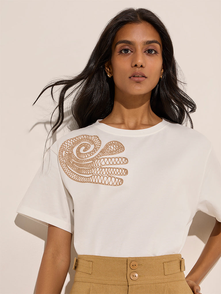 LOV launches this white t-shirt adorned with embroidered detailing. Made with pure cotton. it boasts a round neck and short sleeves.