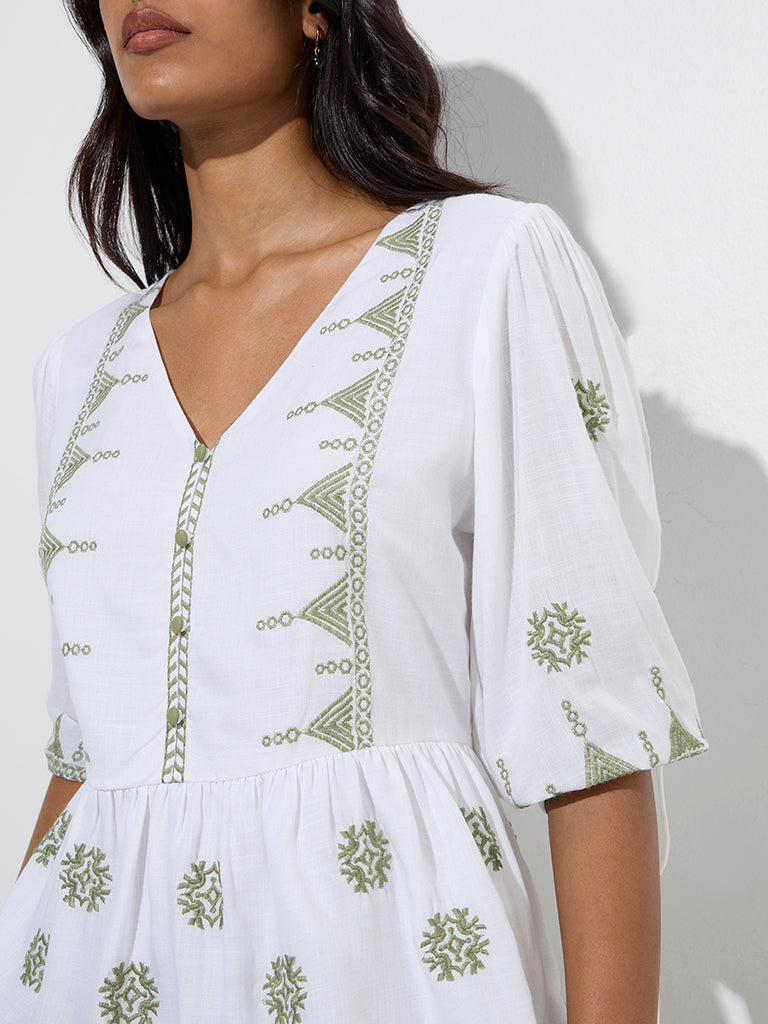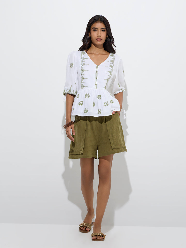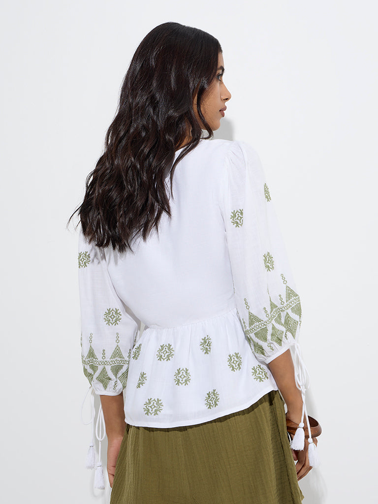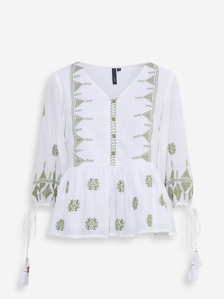 This white top from LOV is carved in a peplum silhouette and accented with geometric embroidery for a touch of detail. Woven from a super-soft fabric. it features a V-neck and blouson sleeves. creating a feminine look that’s perfect for easy-going days.