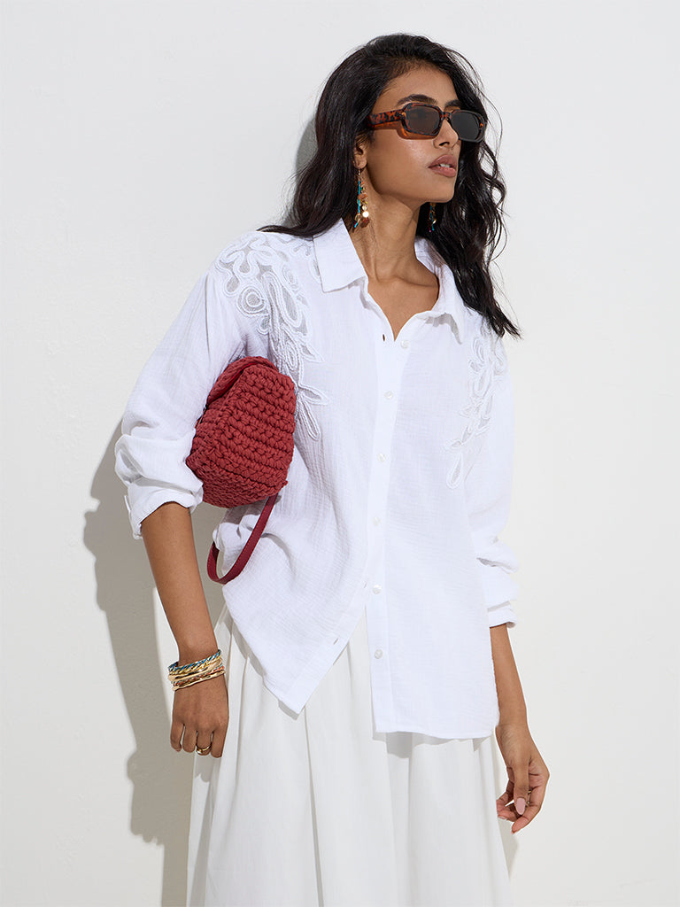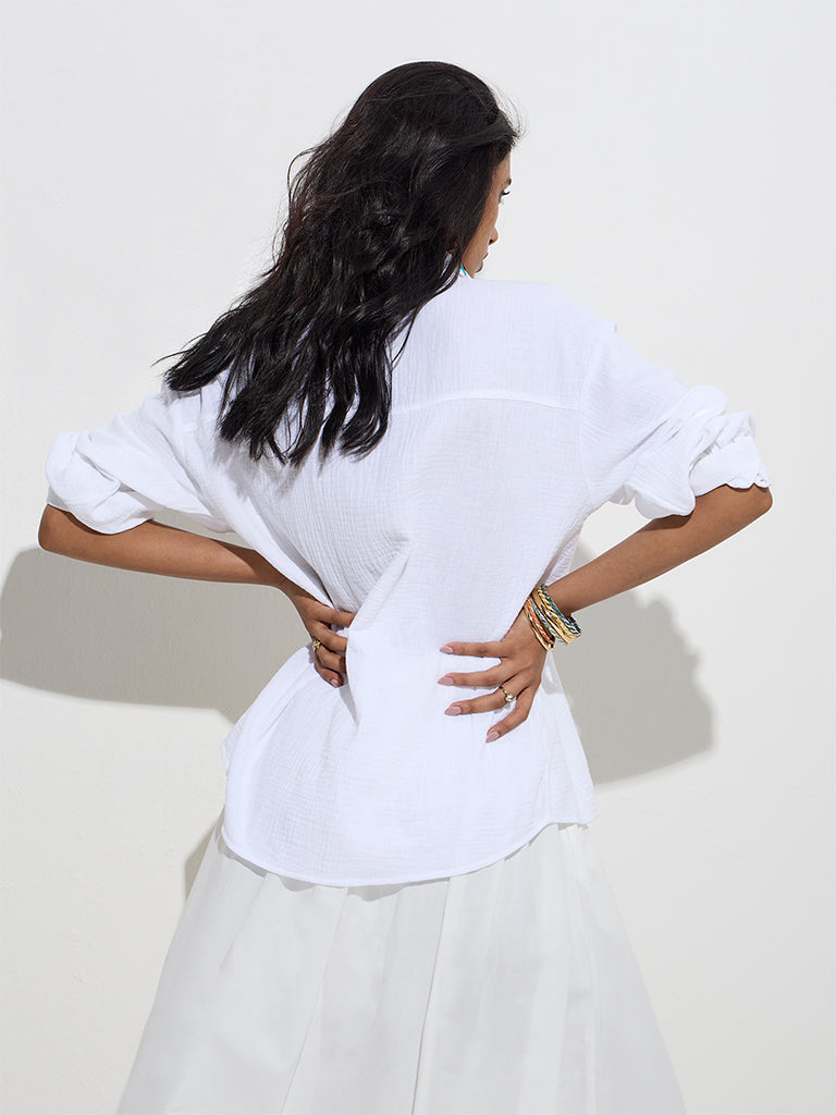 This white shirt from LOV is defined by intricate floral embroidery that sits gracefully on a crinkle-textured base. Milled from pure cotton for a breathable feel. it features a semi-spread collar. a button-up front. and full sleeves with buttoned cuffs.