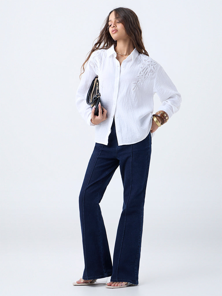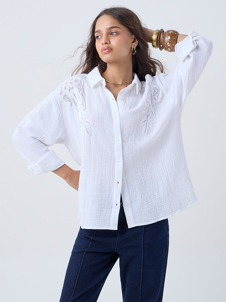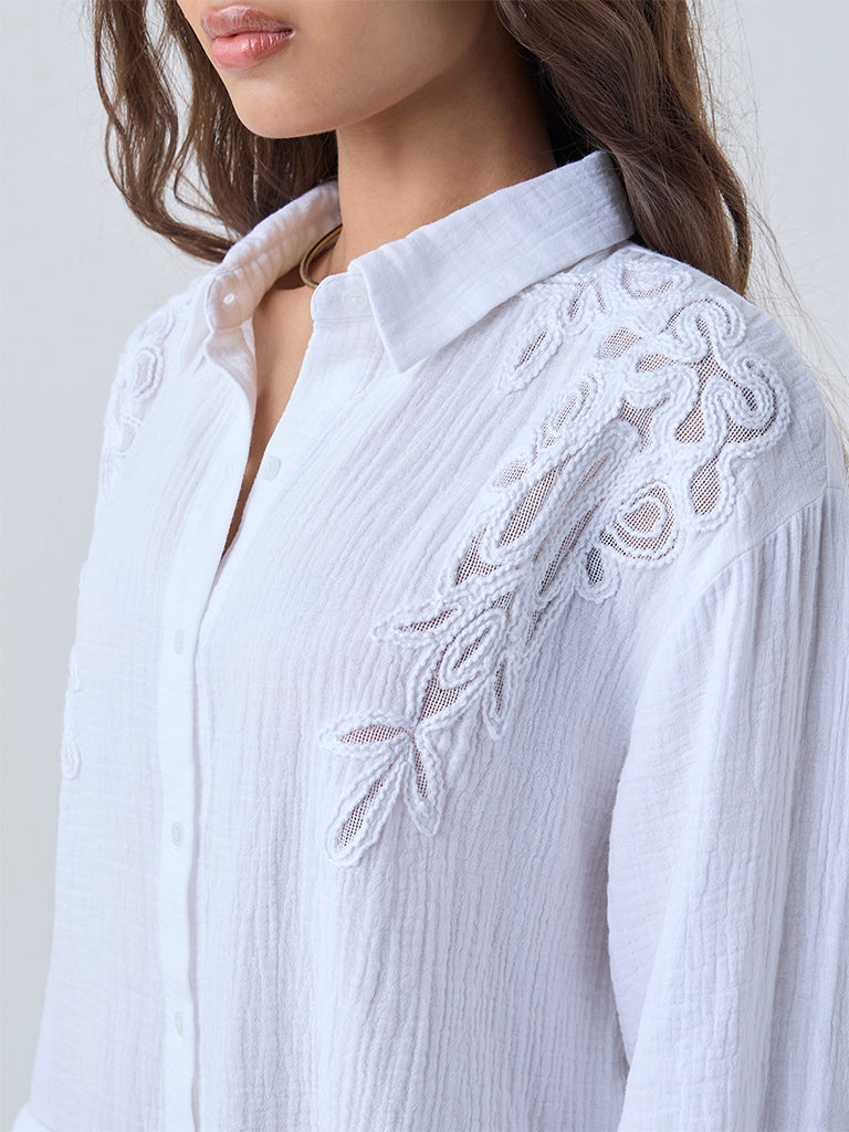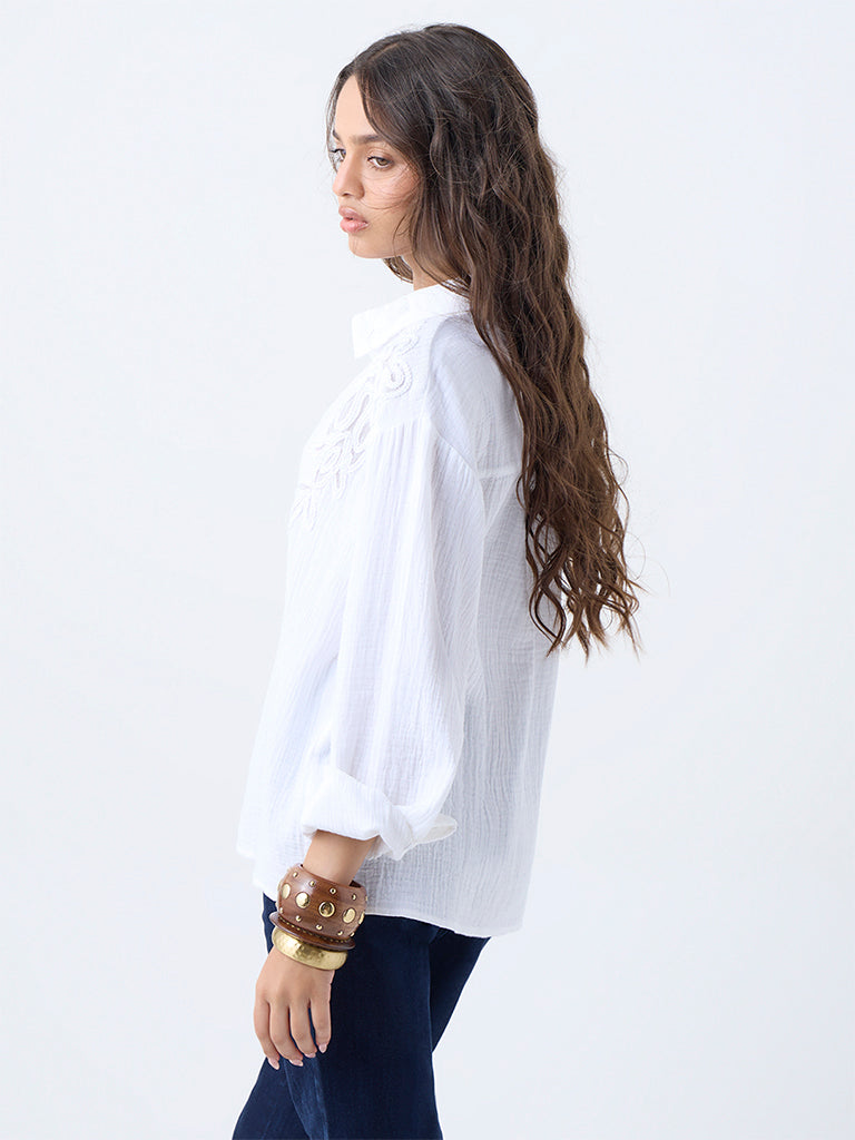 Delicate and refined. this white shirt from LOV is defined by intricate floral embroidery that adds a feminine charm. Crafted from a softly crinkled fabric. it features a classic collar and button placket for structure. while full sleeves bring a graceful finish that transitions effortlessly from day to evening.