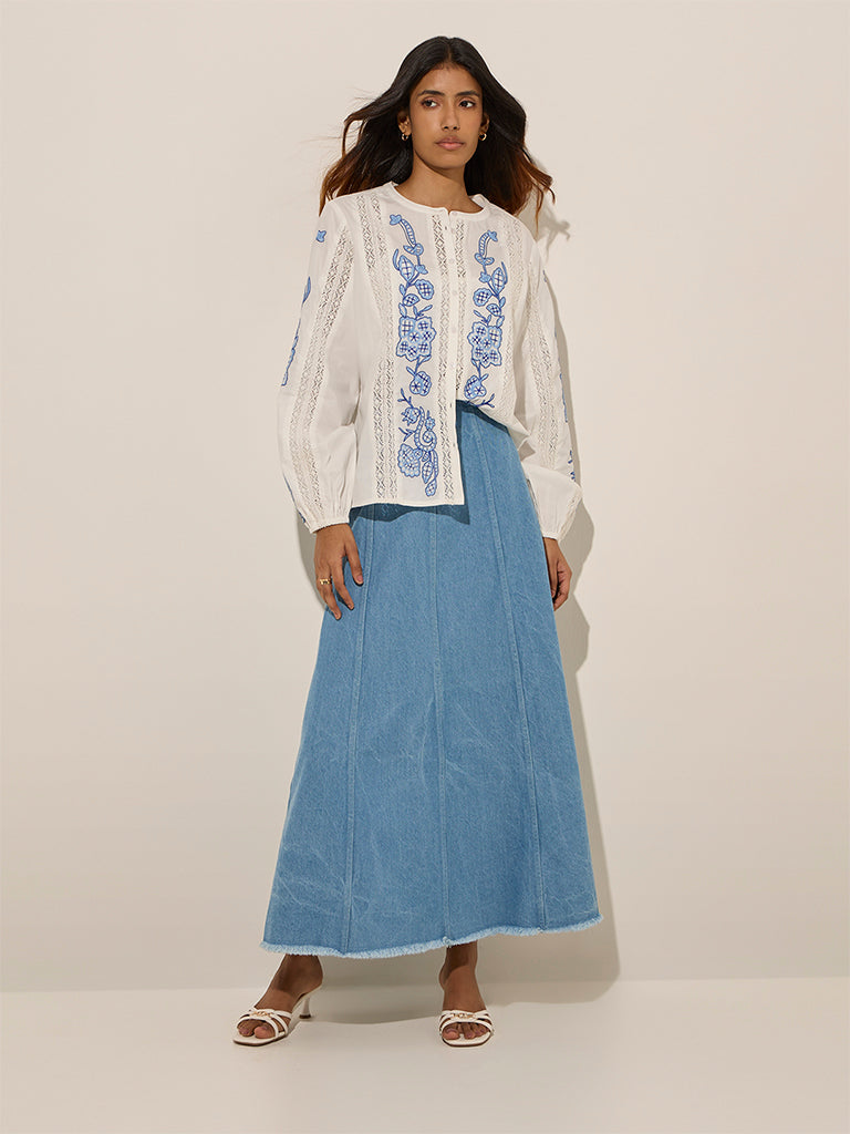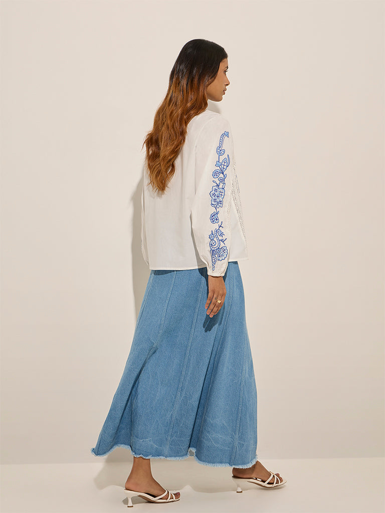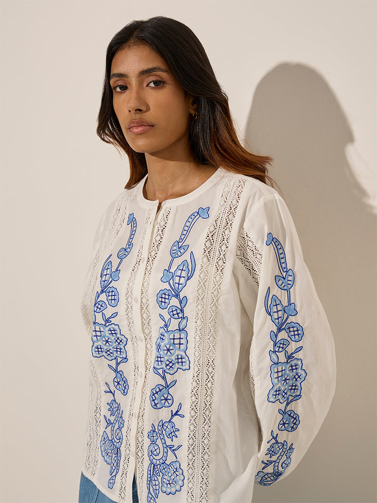 This white top by LOV spotlights floral embroidery with lace detailing. Made from pure-cotton. it comes with a band neck that extends to a buttoned placket and blouson sleeves.