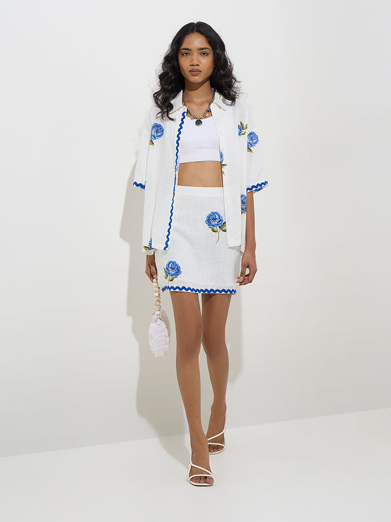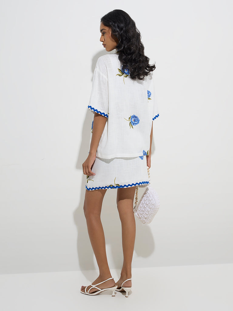 This white skirt from LOV showcases floral motifs and highlights scalloped lace detailing along the hem. Created from a premium linen-blend fabric. it offers a perfect pick for casual-chic occasions.
