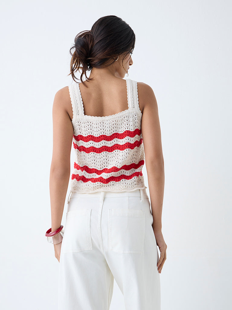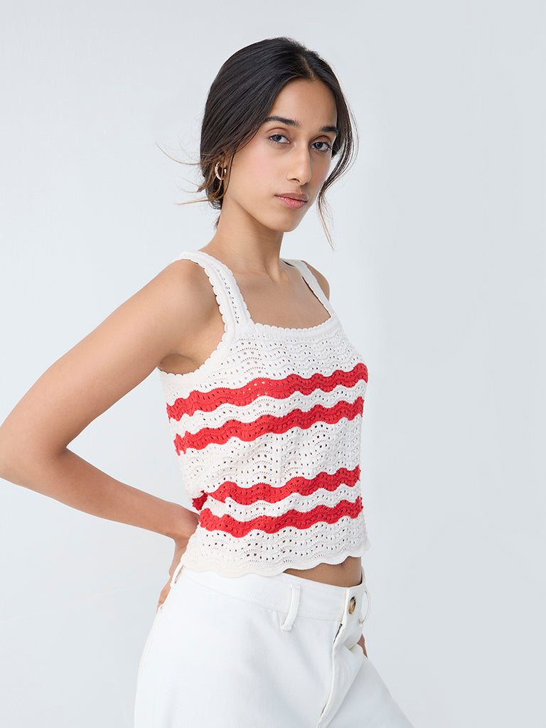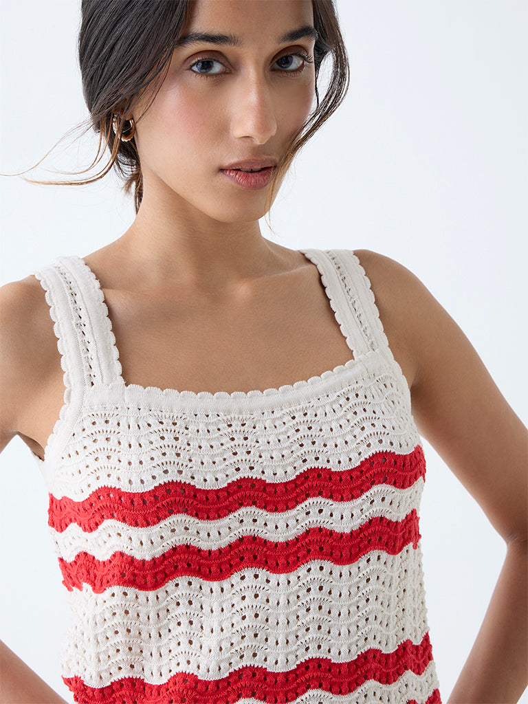 This White top from LOV stands out with its contrast detailing that adds sharp definition to a clean silhouette. Woven from a knit-textured fabric for a cosy feel. it features a square neck and a sleeveless cut that feels both structured and effortless.