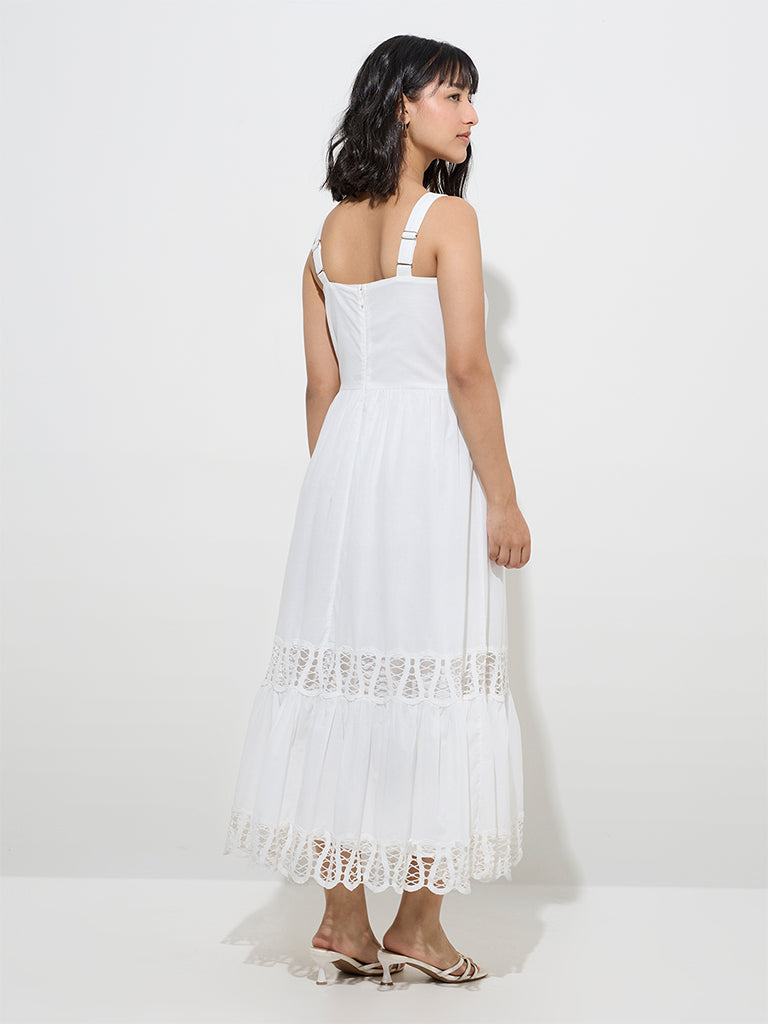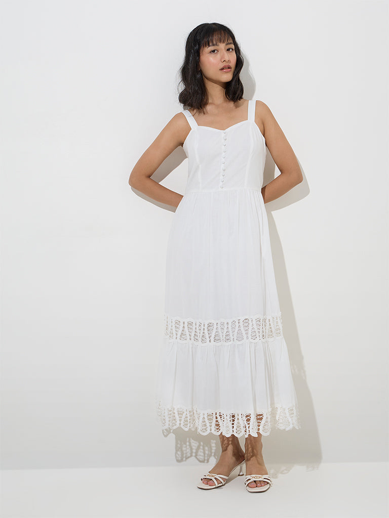 This white dress from LOV is adorned with delicate lace detailing for a timeless charm. Featuring a sweetheart neckline and a button placket on the bodice. it exudes feminine elegance.