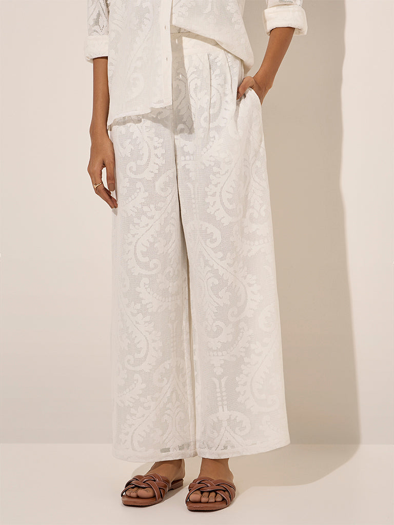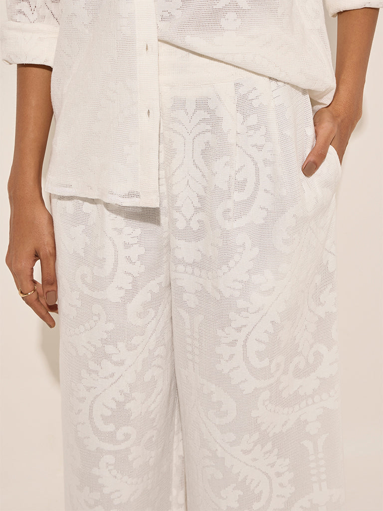 These white pants by LOV flaunt a lace design. The high-rise bottomwear. made with quality fabric. is structured with smooth elastic waistband and side pockets.