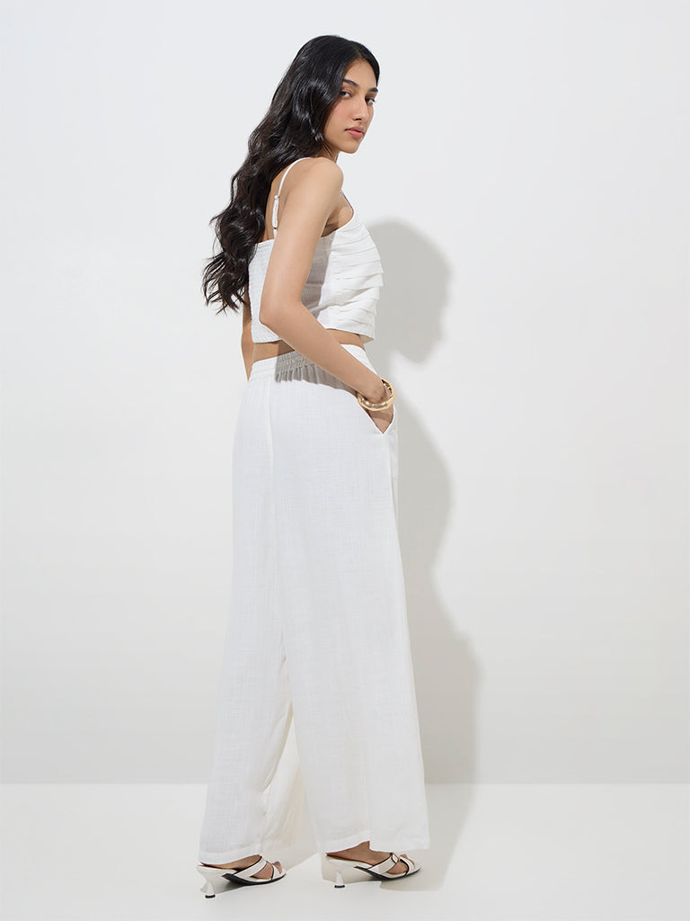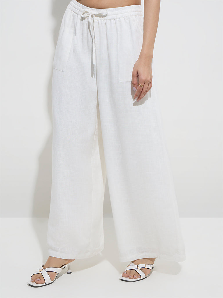 These white pants by LOV are crafted from a rich cotton-linen blend for luxurious comfort. Offering a high-rise fit. they include a smooth elastic waistband. adjustable drawstrings and side pockets.