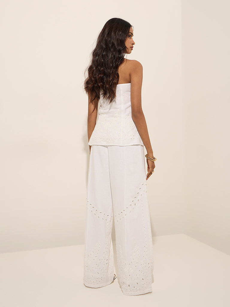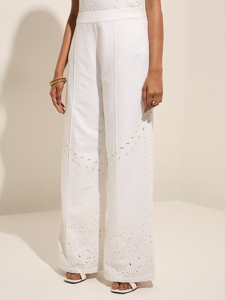 LOV White Schiffli-Detailed High-Rise Cotton Trousers