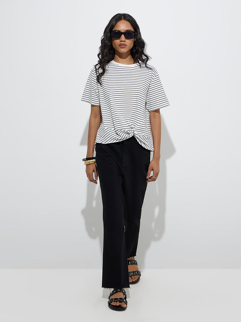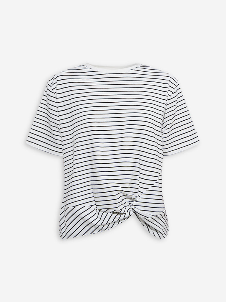 This white t-shirt from LOV is fashioned with stripe prints on a soft cotton-blend fabric. Featuring a knot-style detail at the hem for added flair. it’s completed with a classic round neck and half sleeves.