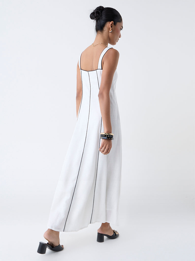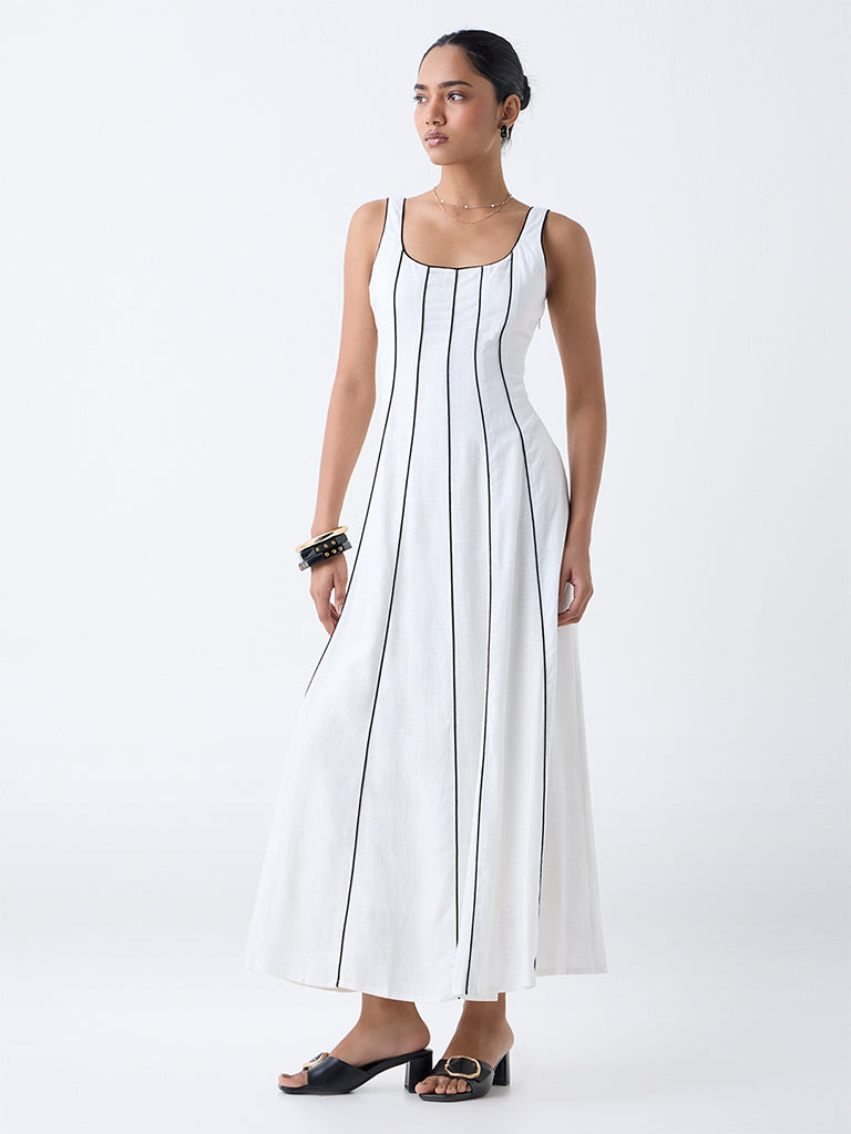 This white maxi dress by LOV is the embodiment of warm-weather ease. With a soft scoop neck and airy silhouette. the linen-blend fabric drapes gracefully. accented by gentle stripes for a hint of interest. Ideal for garden gatherings or barefoot beach strolls.