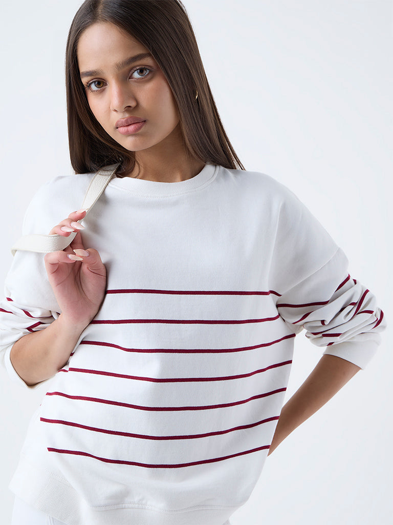 Step into effortless casual style with this white cotton sweatshirt from LOV. Featuring a timeless striped pattern. a round neck. and full sleeves. it delivers a relaxed. comfortable fit perfect for layering or everyday wear.
