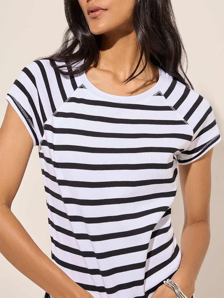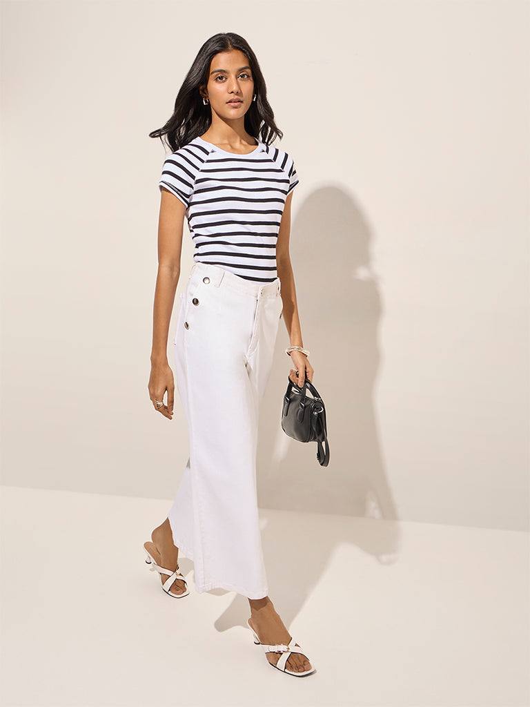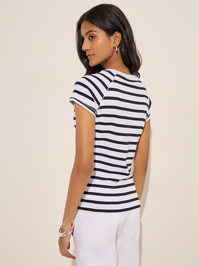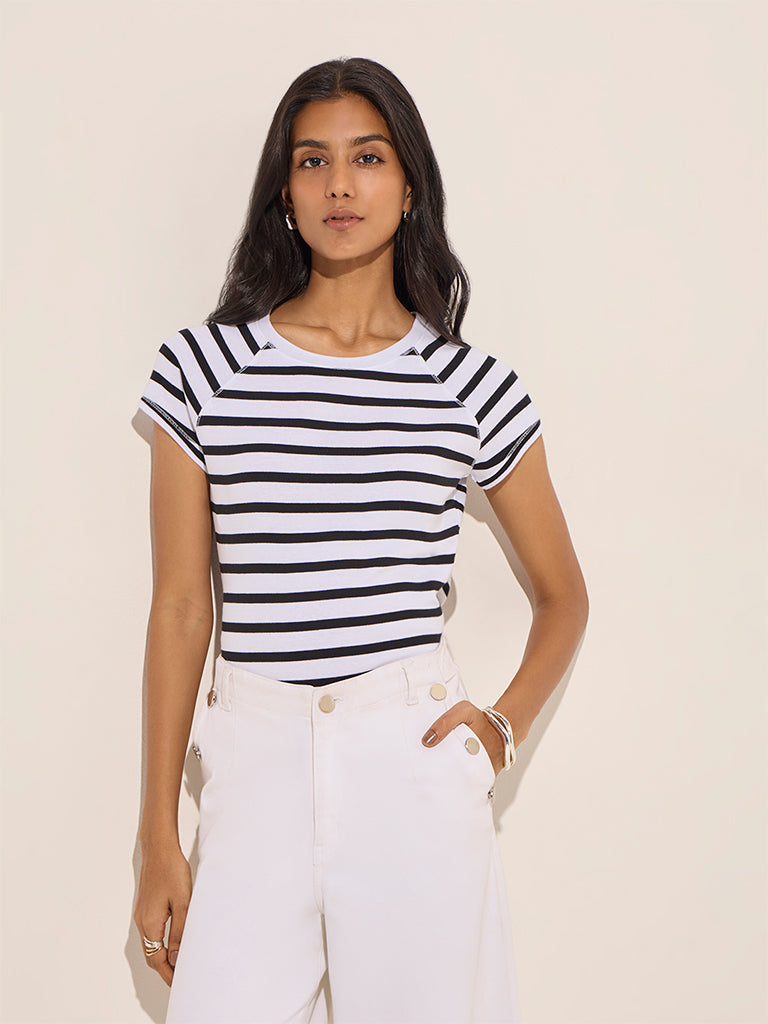 LOV presents elevated casual wear in this white top with a striped pattern. It features a round neck detail with short sleeves.