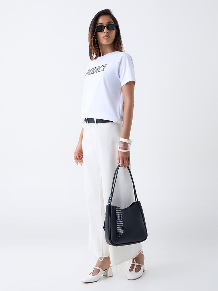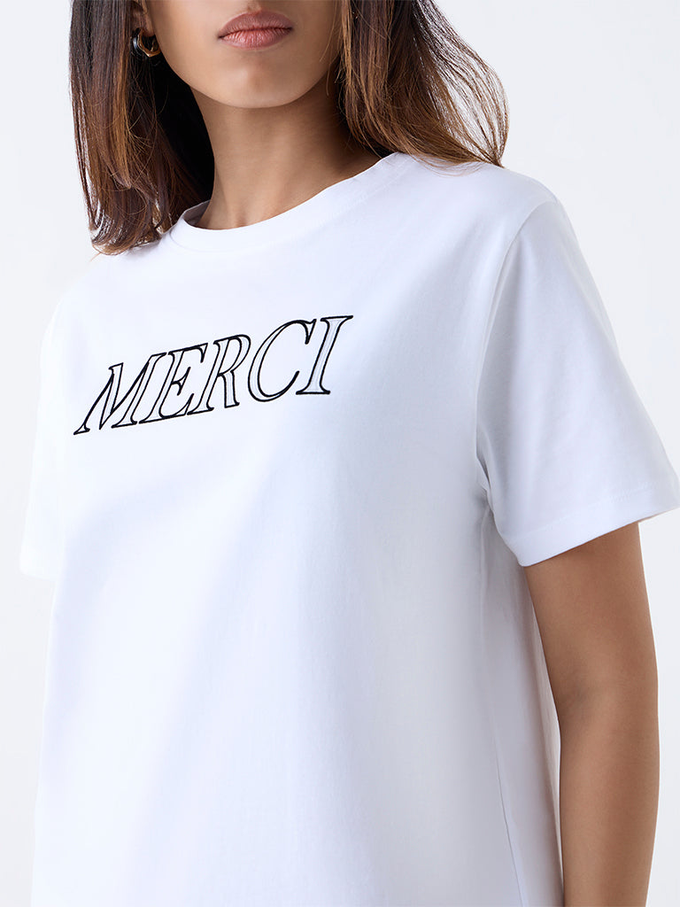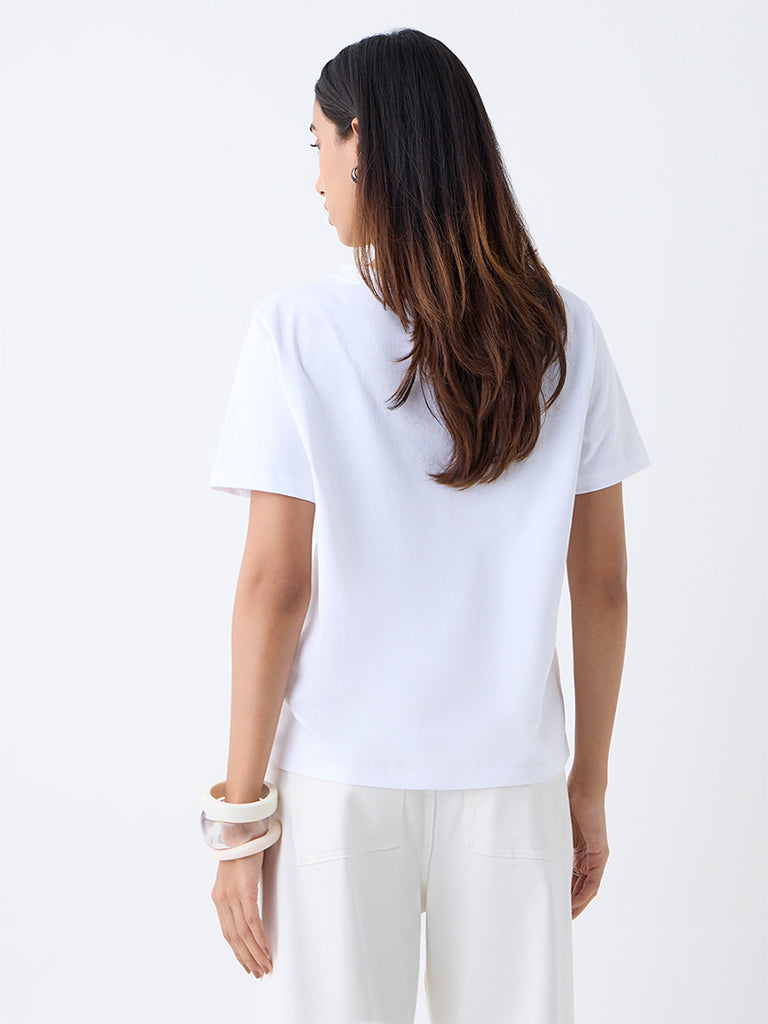 LOV presents a new-age wardrobe staple in this white embroidered cotton t-shirt. The round neck and short sleeves keep it casual. while the minimal detailing turns it into a style statement. Designed to fit every mood. from coffee runs to weekend brunches.