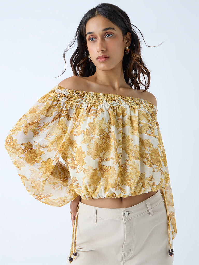 Bring a burst of freshness to your summer style with this yellow top from LOV. Adorned with floral prints all over. it is designed in an off-shoulder silhouette with flexible smocked panels at the neckline and waist and finished with balloon sleeves for a feminine touch. Crafted from a lightweight fabric. it is perfect for warm-weather styling.