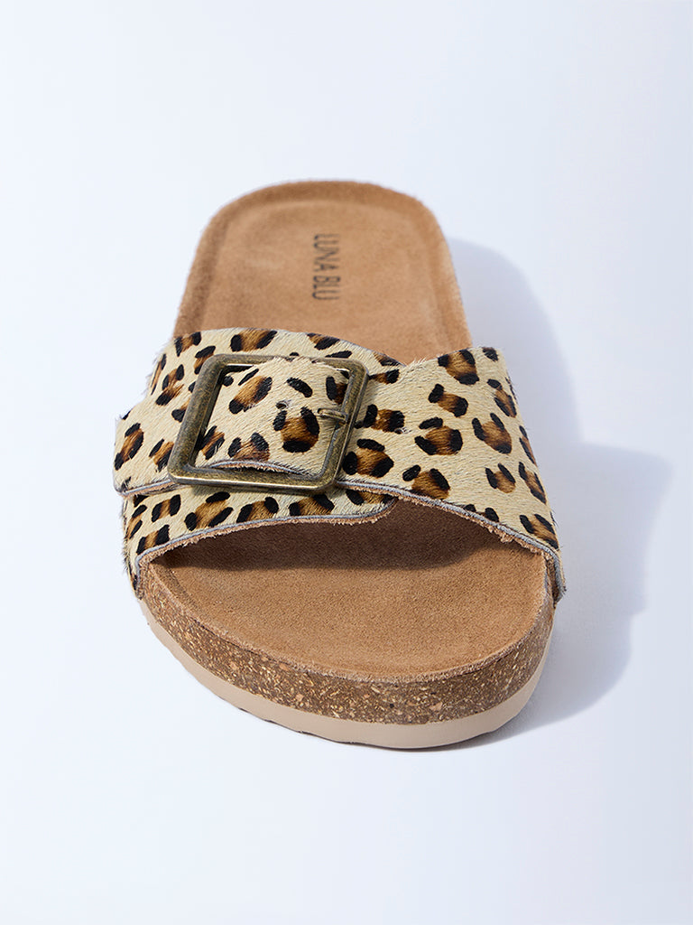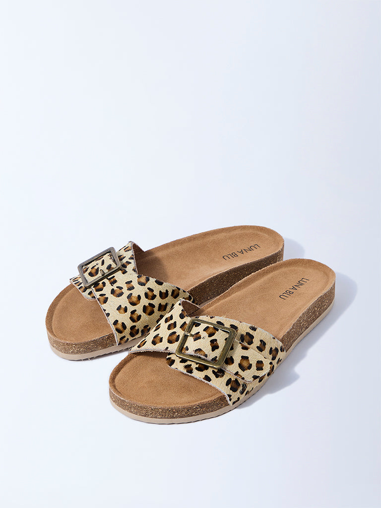 Channel a bold yet effortless mood with these beige sandals from Luna Blu. Showcasing animal-printed wide straps accented with oversized buckles. the pair lends a striking edge to casual line-ups. Finished with a contoured footbed and a ridged outsole. this pair ensures superior comfort and grip through the day.